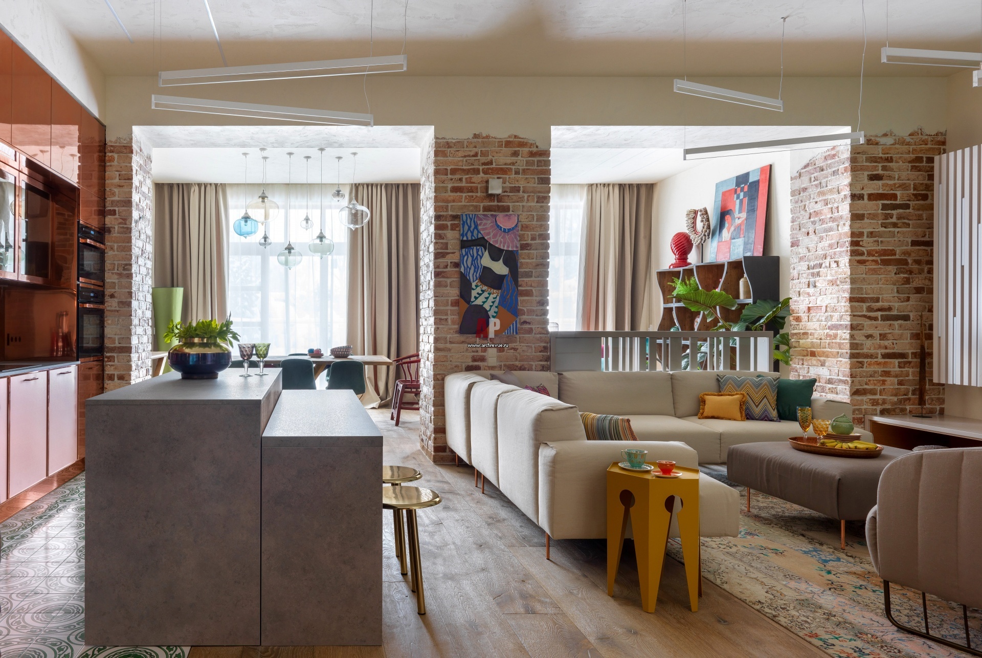 Интерьер гостиной увеличили за счет присоединения террасы. Колонны и часть стен облицованы старинным красным кирпичом 1886 года производства. Его уравновешивает дерево, бетон и декоративная штукатурка.