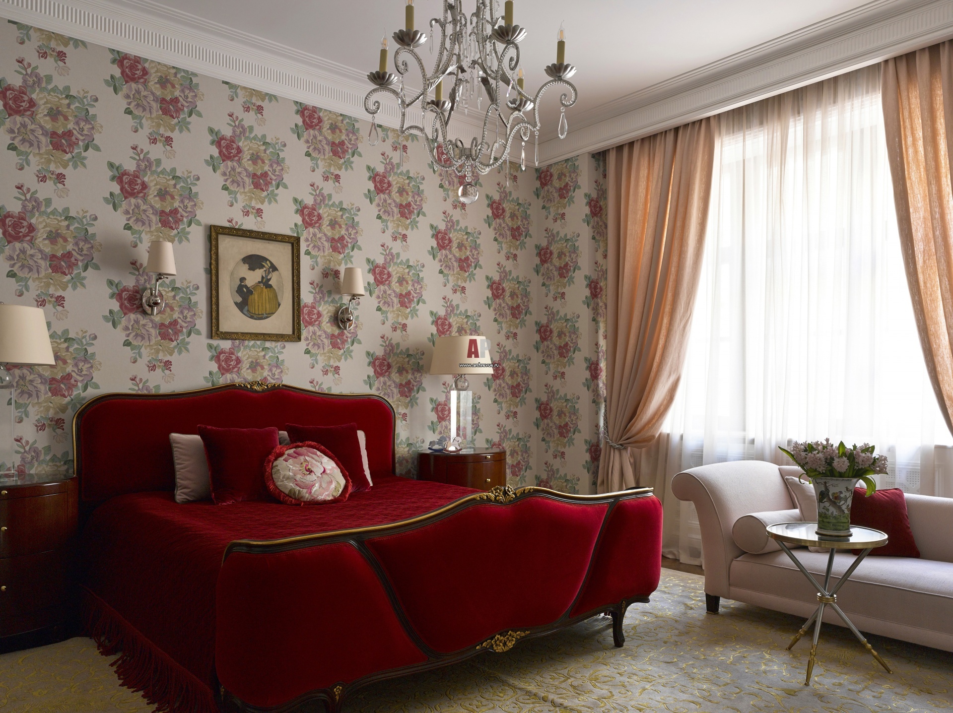 В интерьере спальни дочери красная бархатная кровать сочетается с обоями с крупными цветами и грубыми льняными шторами. Кровать, Angelo Cappellini с изголовьем в обивке тканью Dedar. Центральная люстра, E. F. Chapman, модель Middleton.