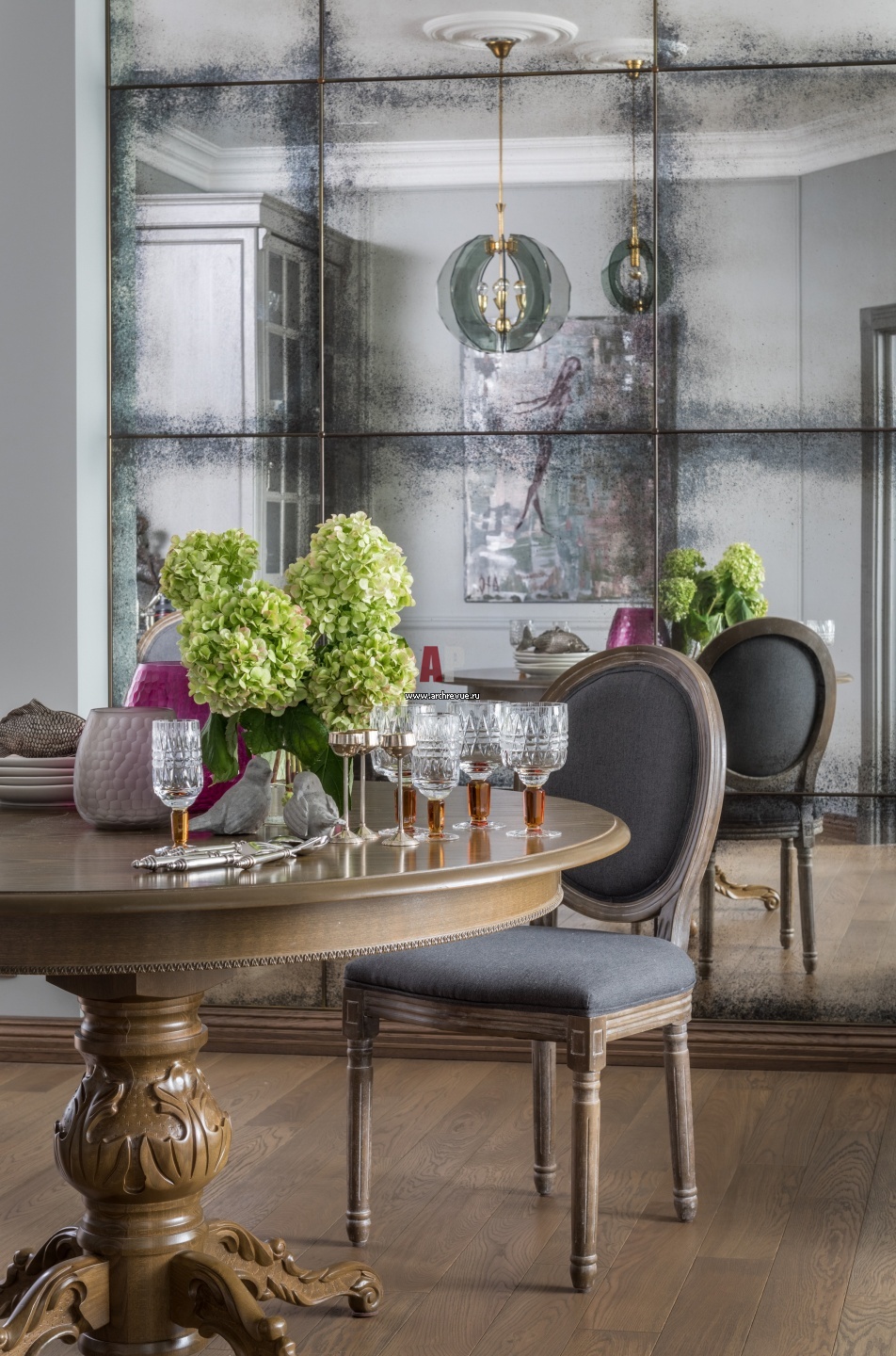 Столовая группа на фоне панно из состаренных зеркал. Каждое зеркало в композиции состаривалось отдельно.