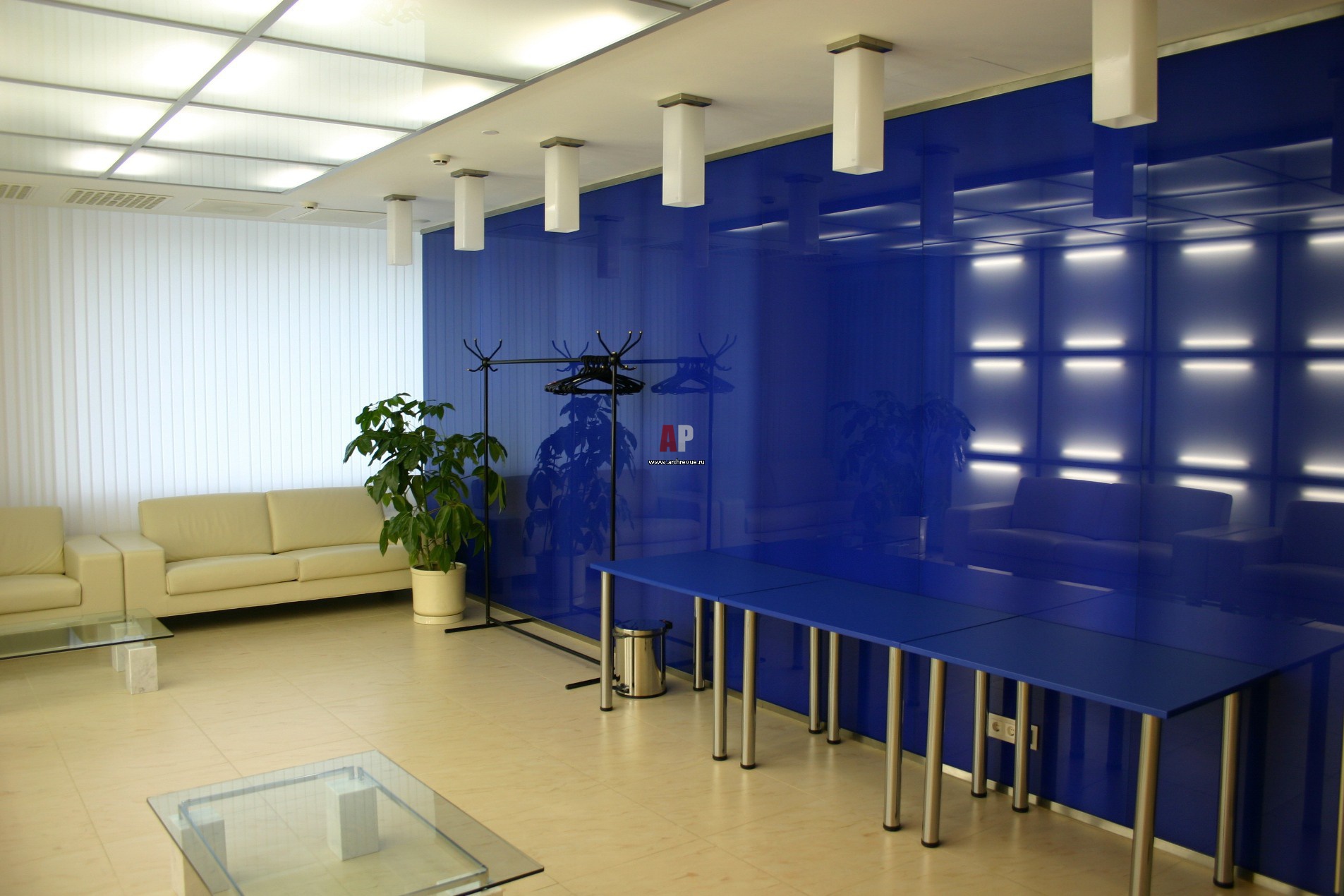 Входная группа выполнена в минималистичном ключе. Ее доминанты – светлый керамогранит Iris FMG, имитирующий натуральный мрамор, поставщик «Гранитогрес», и стеклянные панели, за которые заведены светильники. Синее стекло – не только дань корпоративным цветам компании, но и важный элемент создания стильной и психологически комфортной обстановки.