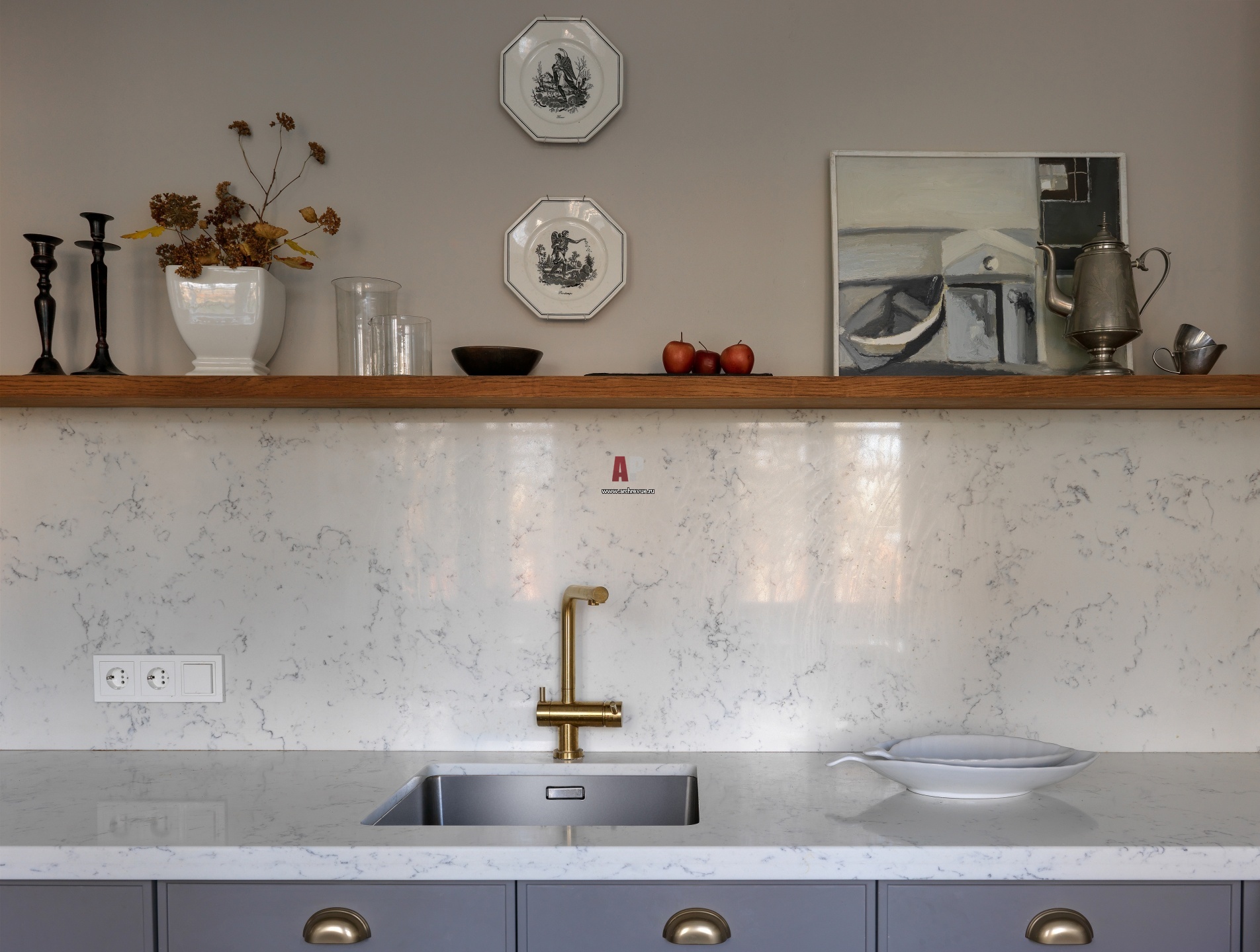Чтобы не перегружать небольшую кухню, дизайнер заменила навесные шкафы на открытую полку. Фартук, облицовка столешницы – искусственный камень.