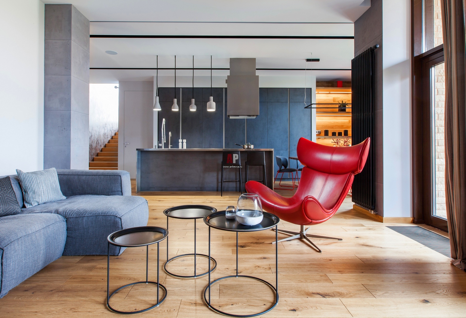 Интерьер гостиной дома в стиле функциональный минимализм. На полу – инженерная дубовая доска под маслом. Красное кресло Imola производства BoConcept хозяева привезли с собой из предыдущего жилья. Диван, Bonaldo. Журнальные столики, BoConcept, модель Cartagena.
