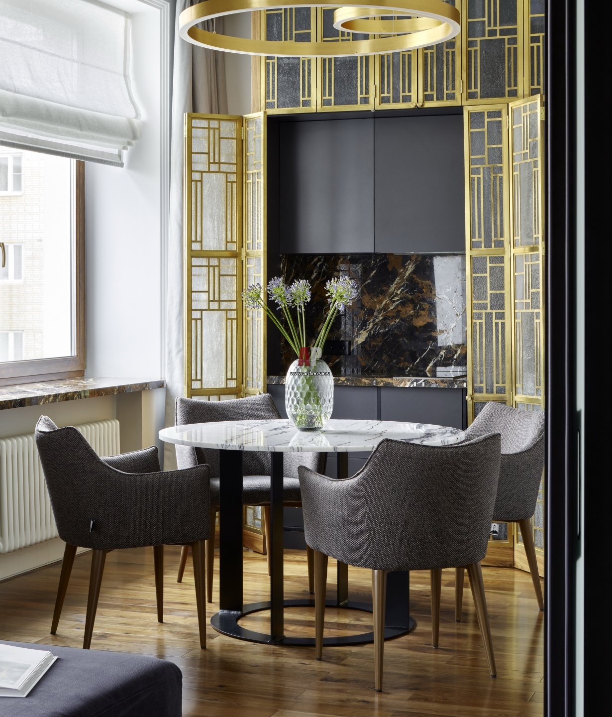 Зона кухни-столовой в стиле ар-деко. Обеденный стол с подстольем из черного металла и столешницей из мрамора Arabescato сделан на заказ по эскизам авторов проекта. Стулья, Deep House, модель Moscow by Denis Simachev.