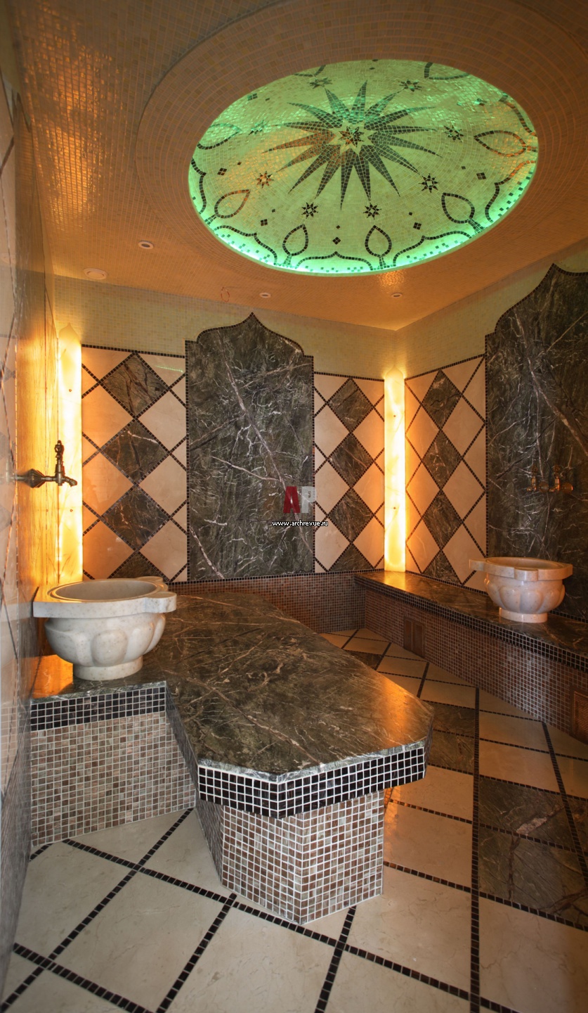 Турецкий хаммам отделан мрамором с мозаичными вставками. Декоративный купол также выложен мрамороной мозаикой. Поставщик мозаики, поставщик ILLUSION LAB..