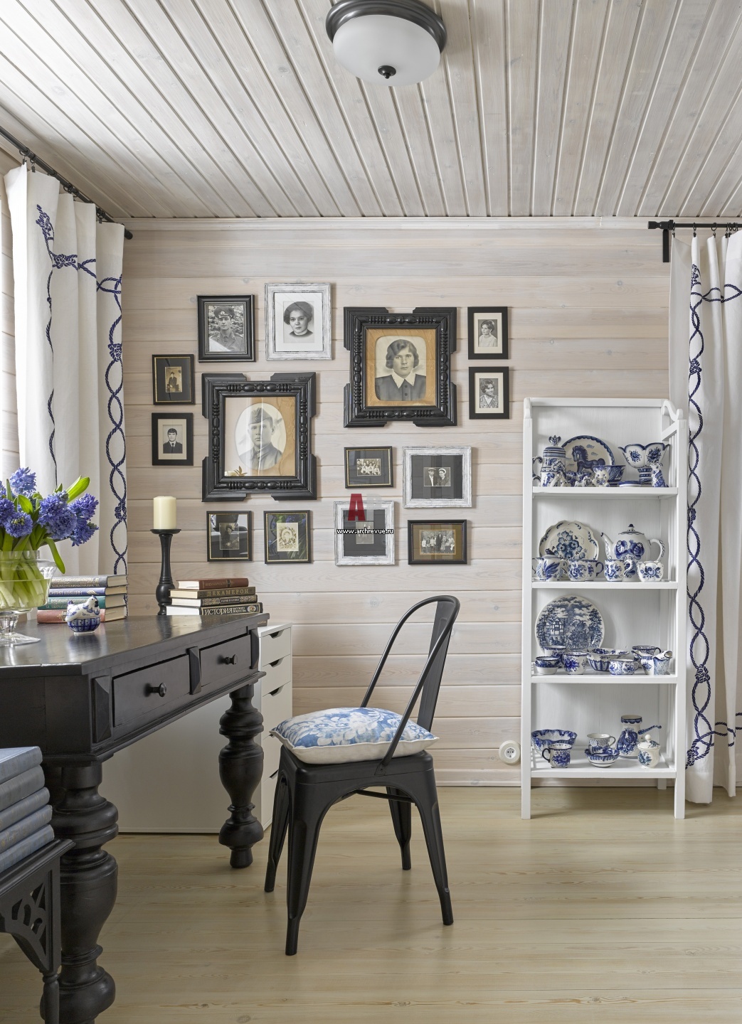 Интерьер кабинета. Со светлыми стенами контрастирует черный стол с пузатыми ножками. Он, как и белый стеллаж с коллекцией гжели, достались по наследству. На стене - семейные фотографии.
