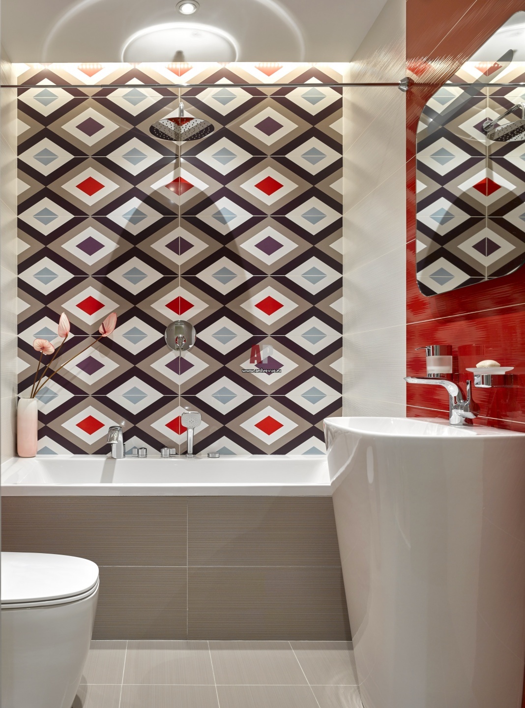 Ванная комната дочери решена в насыщенном красном цвете. Сантехника, Ideal Standard. Керамогранит, FAP Ceramiche.