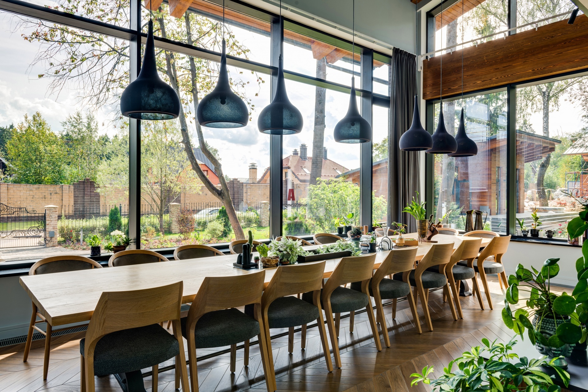Парадная столовая находится в стеклянном объеме. Обеденный стол длиной 6 метров, шириной 1,5 метра и весом 500 кг изготовлен из цельного древесного слэба по эскизам автора проекта на фабрике Arxe. Стулья, Voglauer. Светильники, Cattelan Italia.
