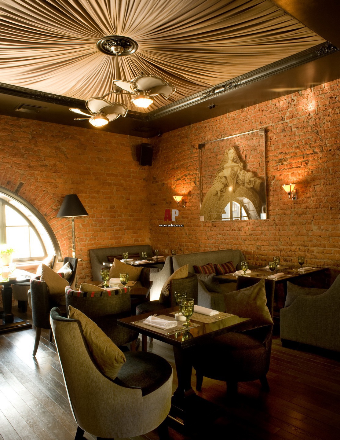 Потолок задрапирован тканью из шелка. Этот прием придает обстановке нарядный вид и создает атмосферу отдыха.