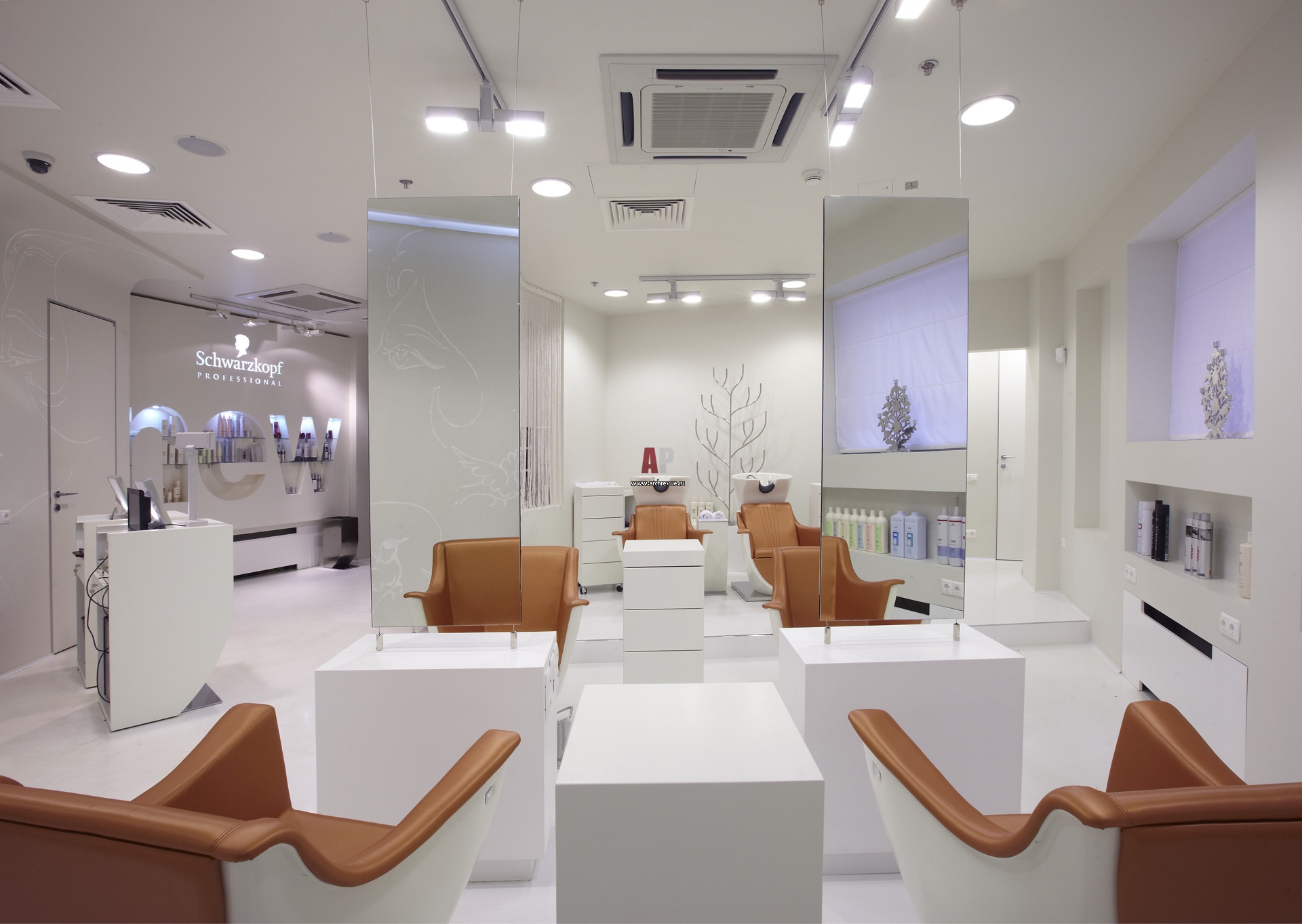 С монохромными стенами и полом контрастируют рыжие кожаные парикмахерские кресла . Как настенное панно работают подсвеченные логотипы салона, вырезанные в гипсокартонных панелях. Средства для укладки волос собраны в одном месте, на стеклянном стенде в нише за композицией основного логотипа заведения.