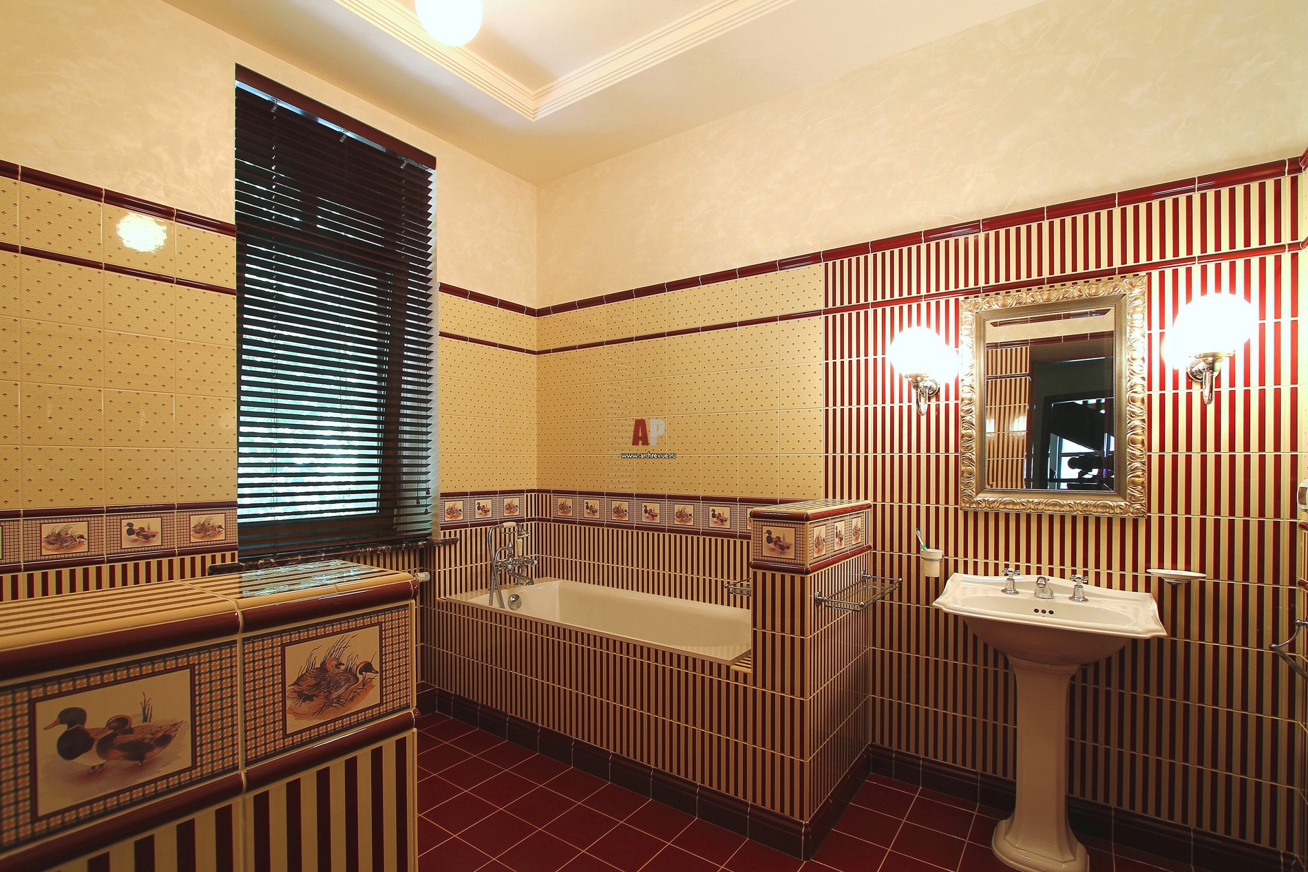 Ванная комната в английском стиле. Оформление – плитка Original Style в брусничной цветовой гамме. На декоративном канте изображены утки.