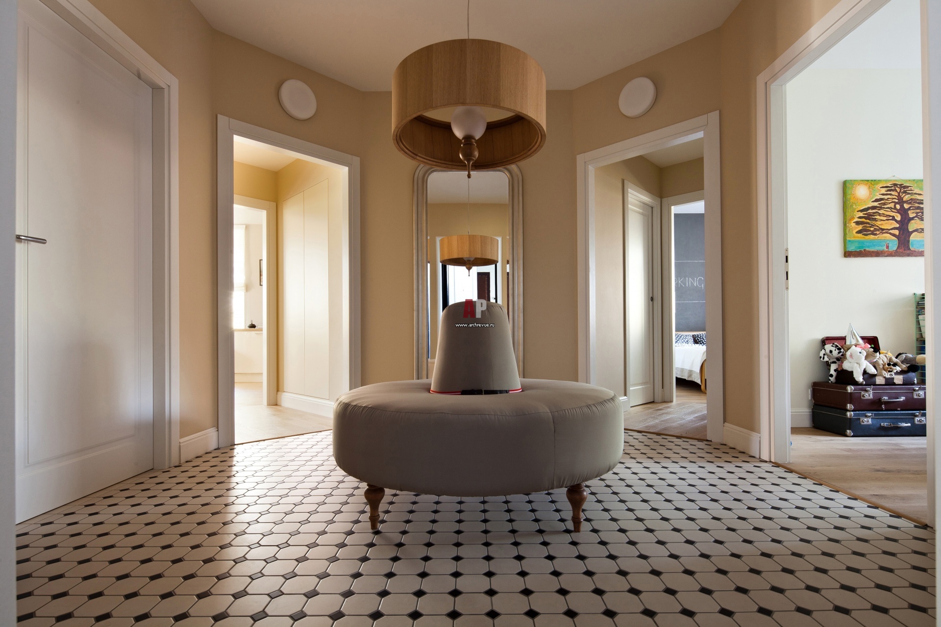 Холл в форме многогранника вдохновлен сталинской архитектурой здания. Он позволил спрятать расположенную по центру несущую колонну, убрать дверь в ванную комнату с оси входа, построить просторный эффектный холл и разместить вход в жилые помещения симметрично относительно главной оси. На полу – метлахская плитка, TopCer. Диван-пате, на заказ. Подвесной светильник, MOOOI.