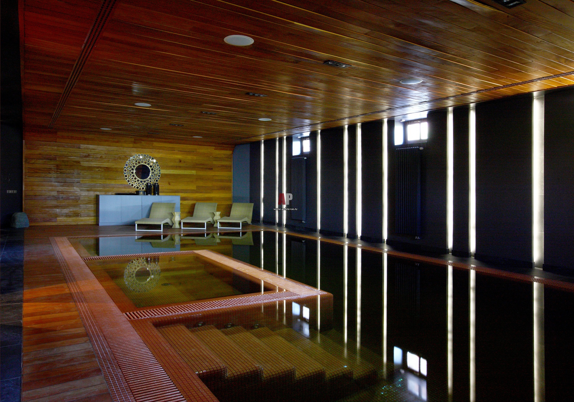 Фото интерьера бассейна. Стены и потолок зашиты деревянной доской, пол также деревянный.