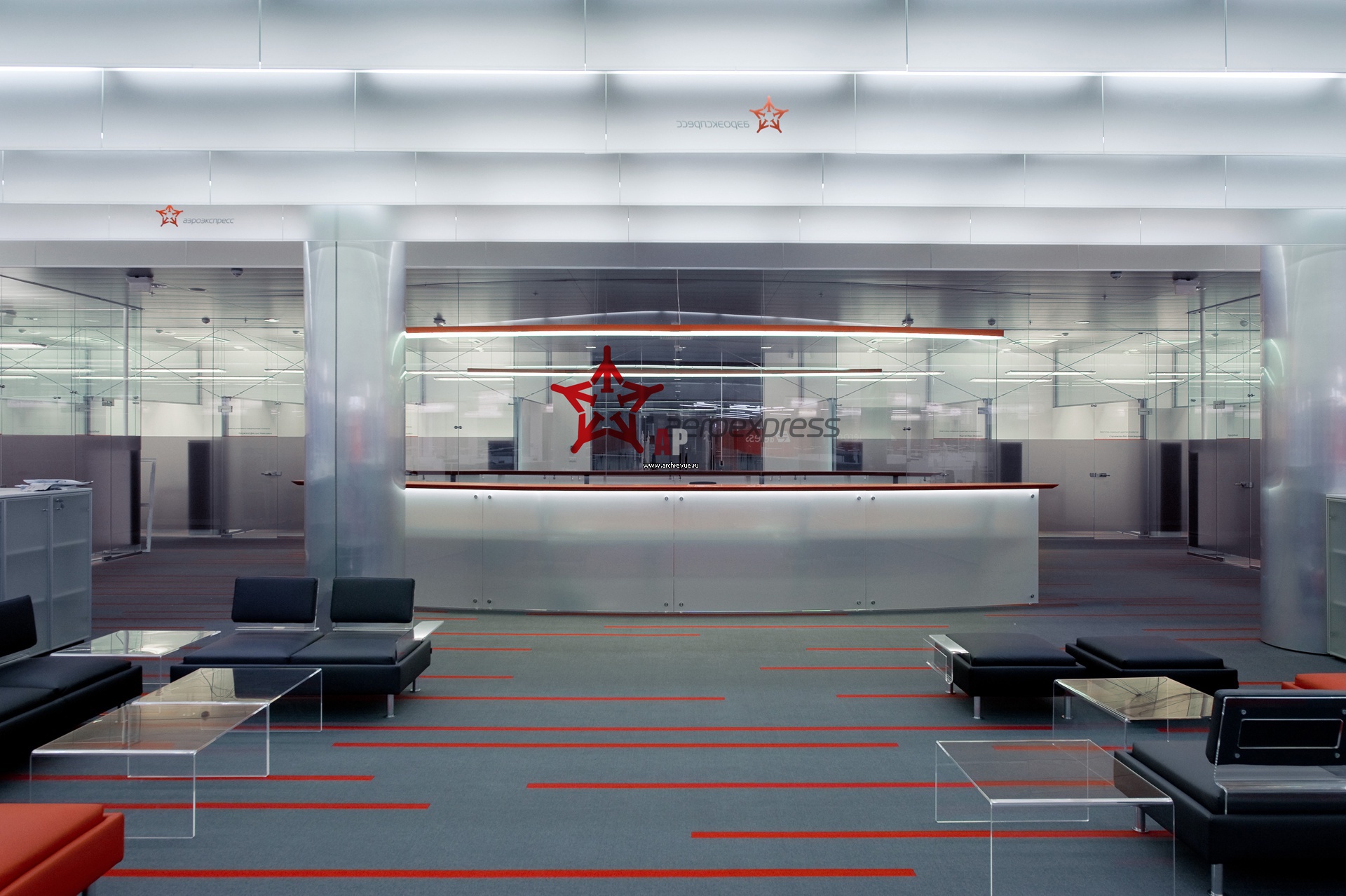 Приемная с рабочей зоной open space и зоной отдыха. Динамику, заданную светильниками, поддерживают и напечатанные на ковролине узкие красные полосы.