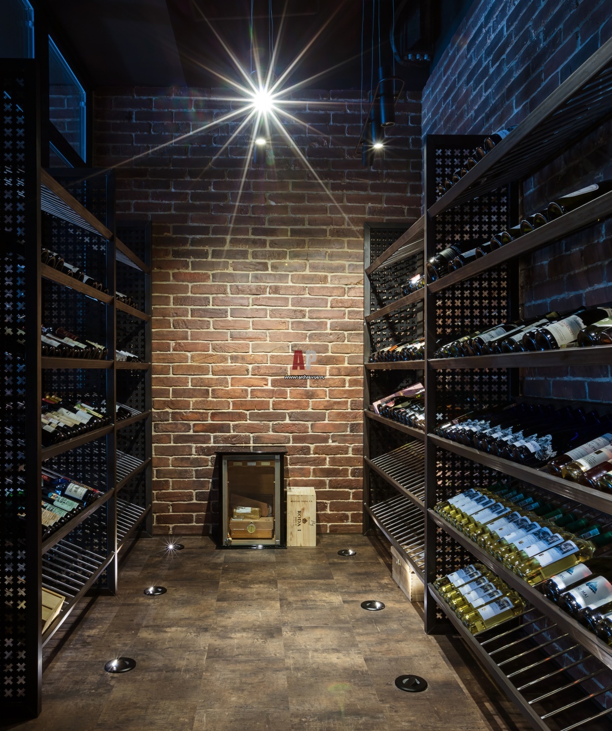 Винный погреб с дегустационной зоной в цокольном этаже. Он выполнен в стилистике лофта с красным кирпичом, ажурными стеллажами из черного дерева и промышленными светильниками.
