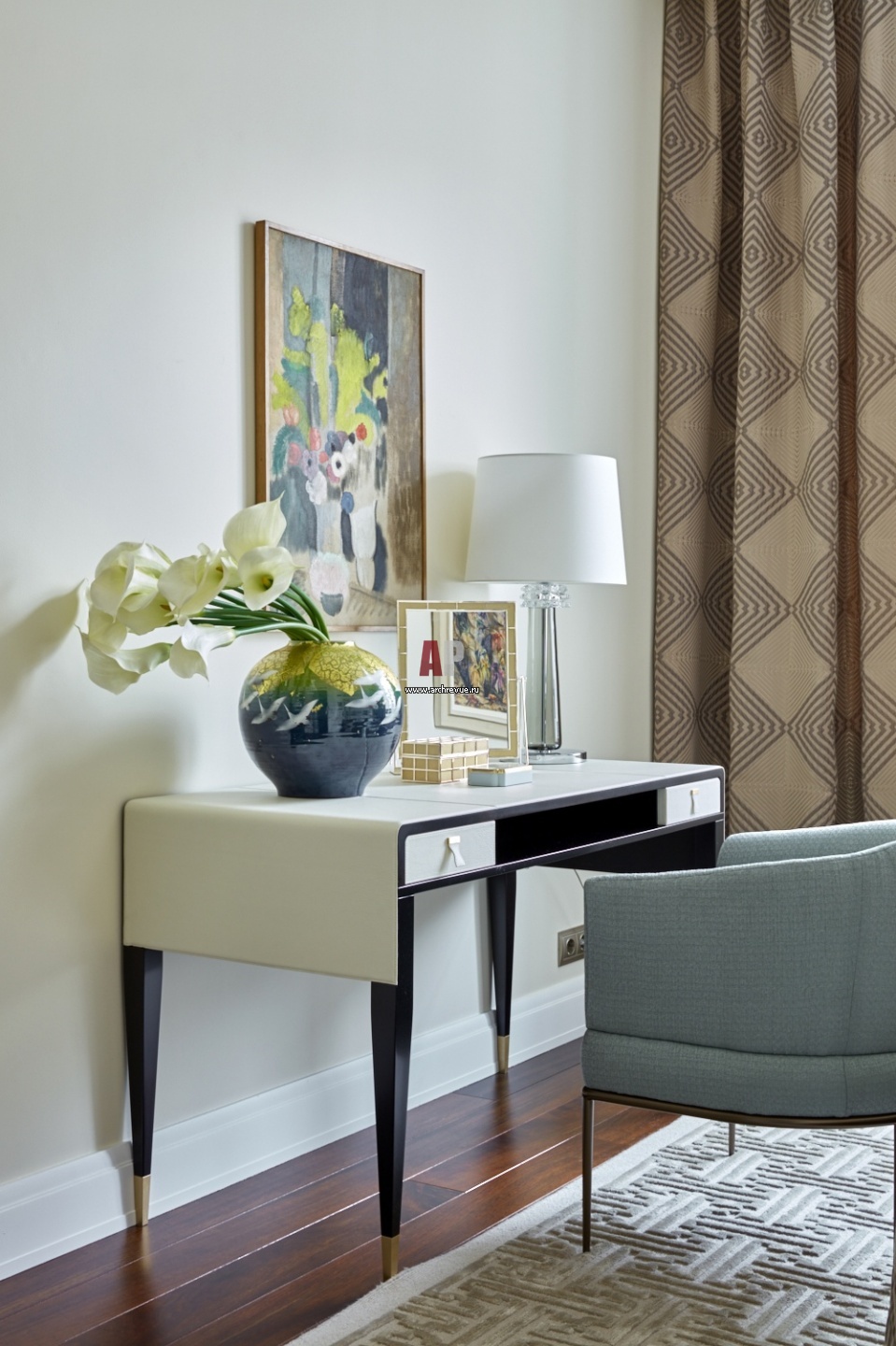 Интерьер спальни исполнен в светлых сливочных тонах. Косметический стол американского ореха, клена и латунных вставок сделан на заказ по эскизам автора проекта.