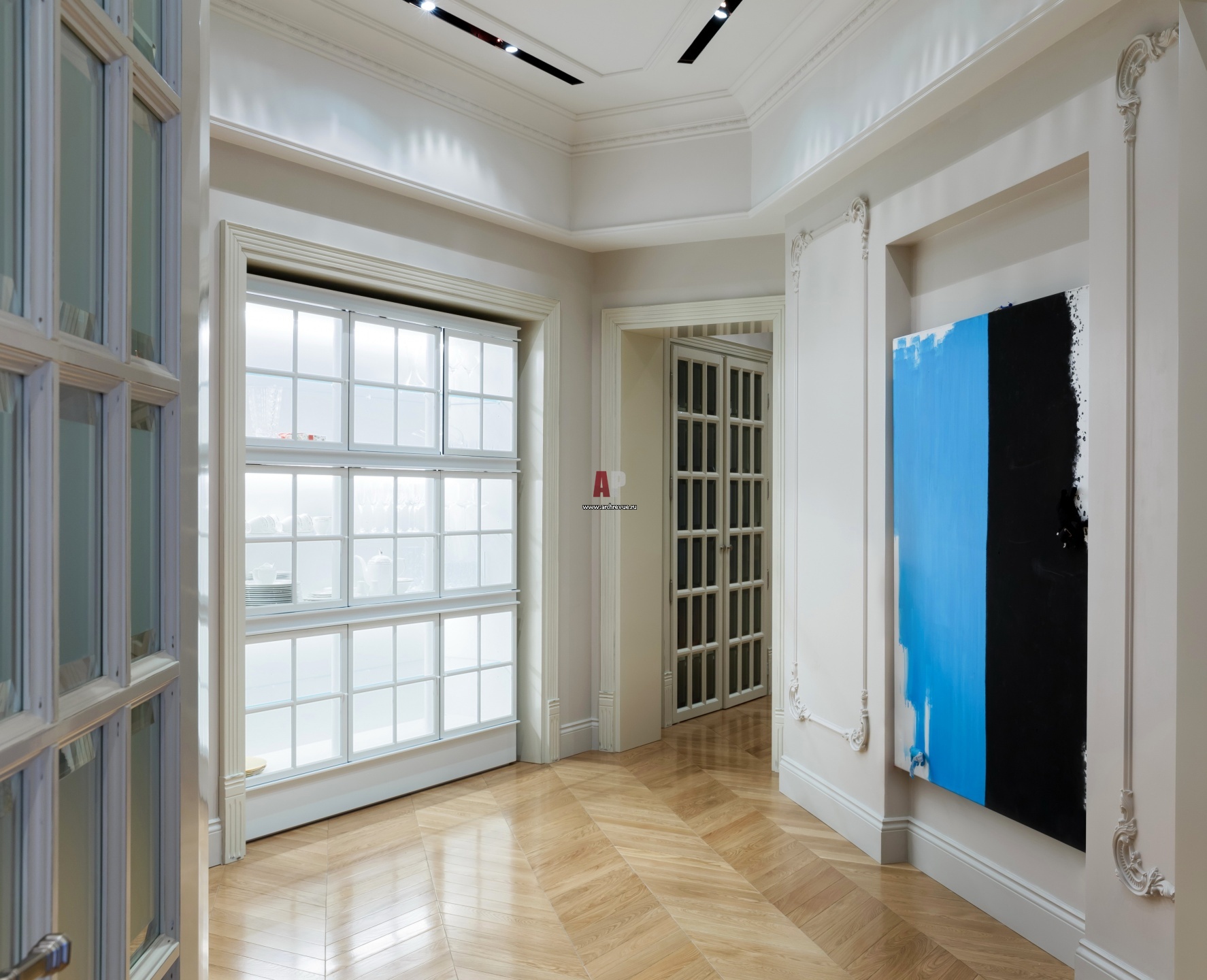 Интерьер холла. Сложную конфигурацию пространства подчеркивают потолочные встроенные светильники черного цвета. Светлые краски в оформлении стен, работающий на просвет буфет с подсветкой компенсируют нехватку солнечного света в удаленных от окон проходных помещениях.
