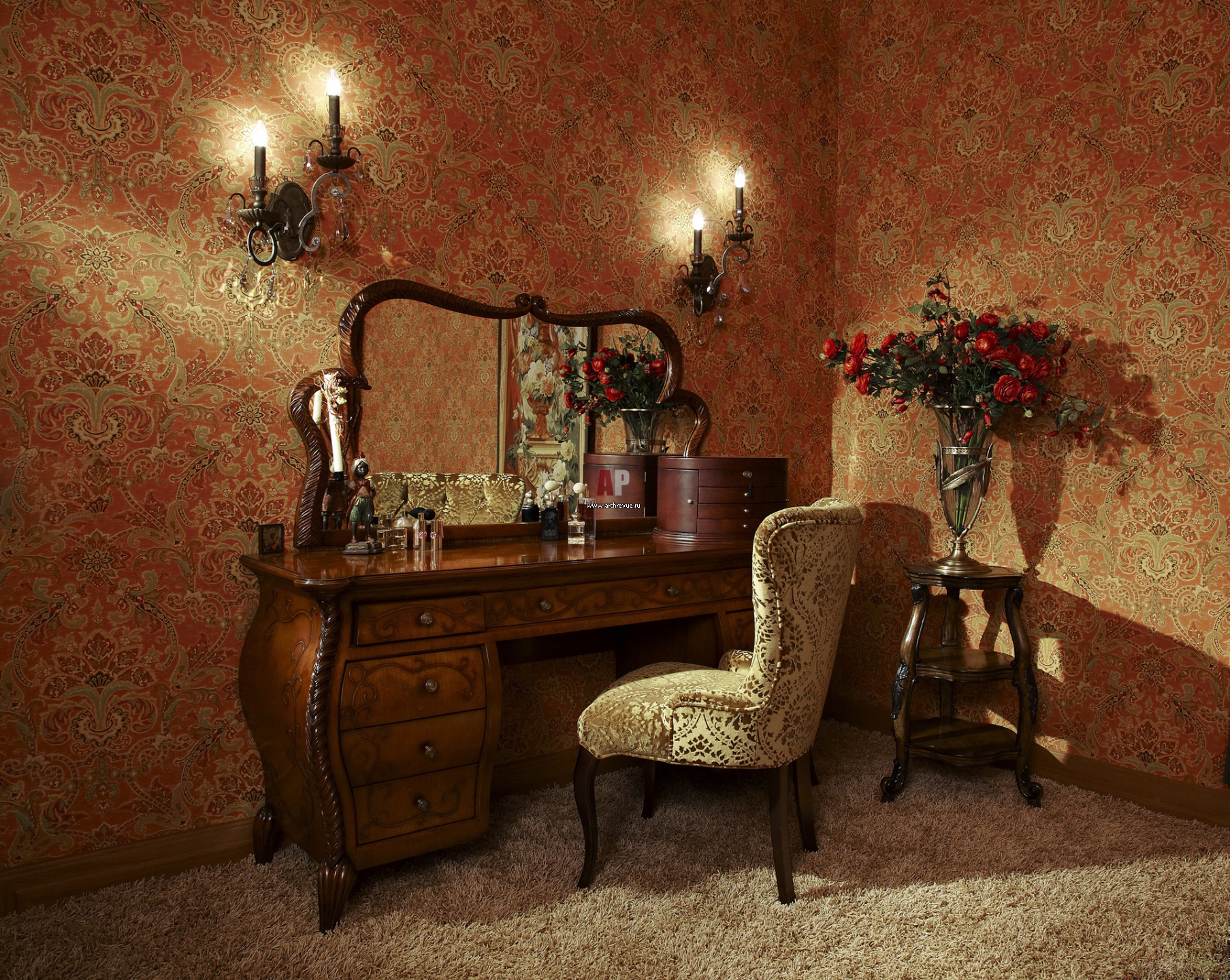 Будуар при спальне в стиле неоклассика. На стенах – бумажные английские обои терракотового цвета с пышным орнаментом.