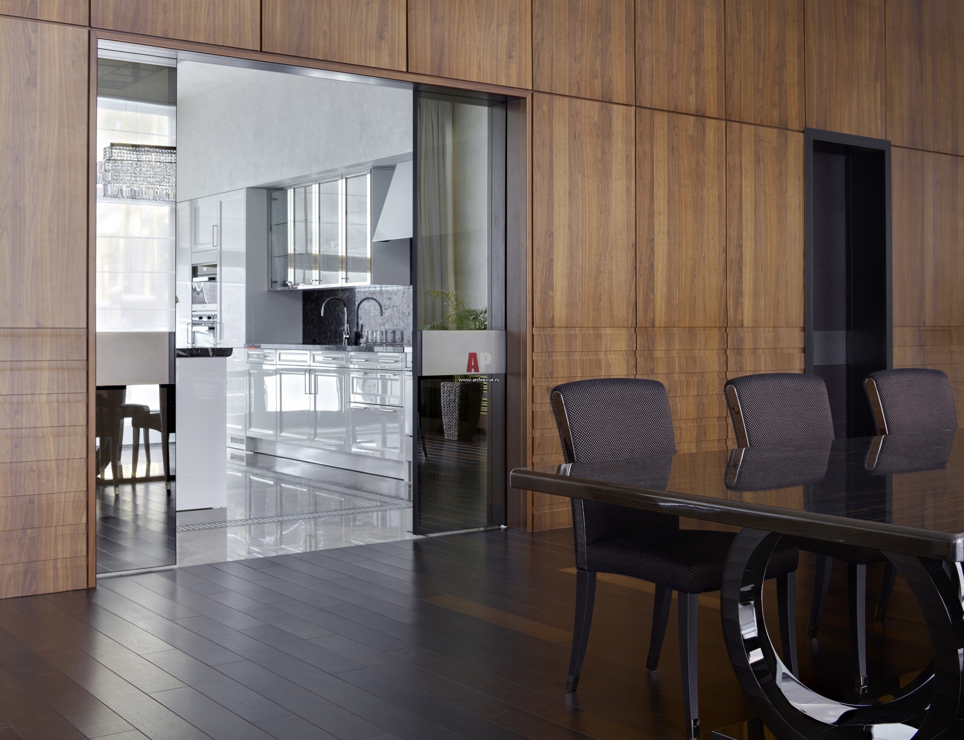 Кухня отделена от столовой перегородкой из американского ореха с раздвижными стеклянными дверями.