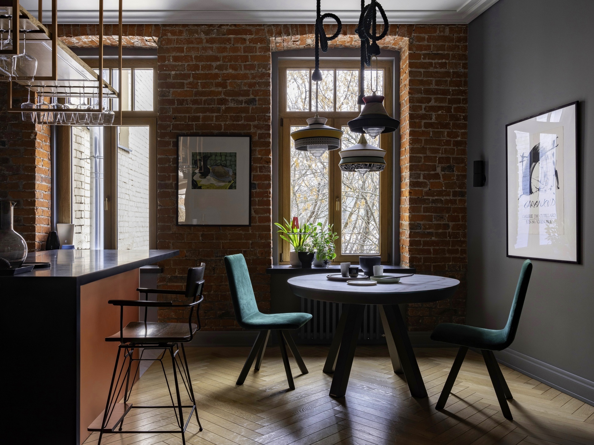 Изначально архитекторы планировали сделать монохромный лаконичный интерьер, но во время демонтажных работ увидели кирпичную кладку и уже не смогли с ней расстаться. Столовая, обеденный стол и стулья, Mobliberica. Подвесные светильники, Contardi.