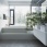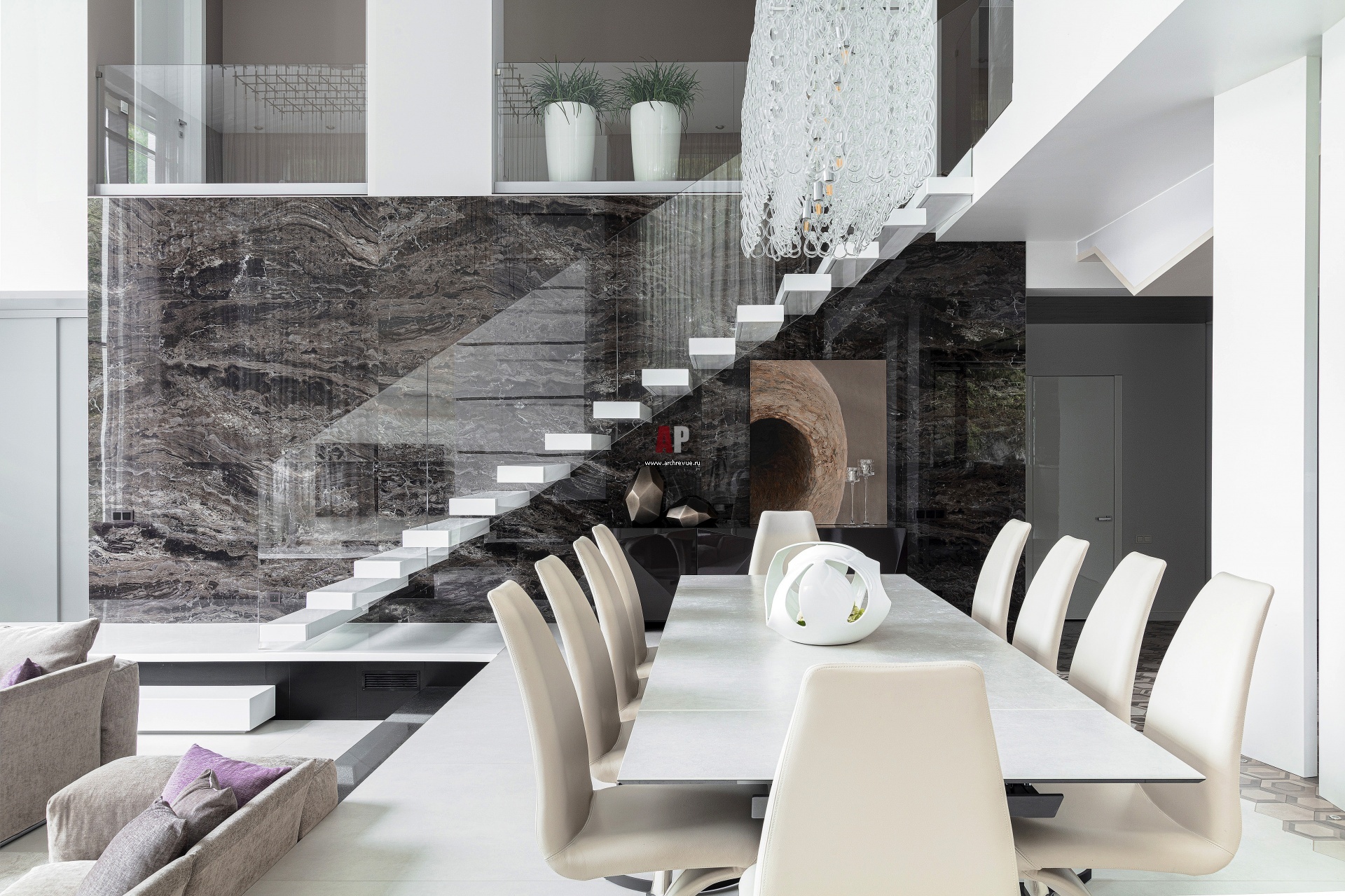 Стена за консольной лестницей отделана черным керамогранитом, Mirage, серия Privilege. Ступени лестницы выполнены из белого искусственного камня. Ограждение – стеклянное полотно без видимых стыков. Картина под лестницей работы Евгения Зарембо.