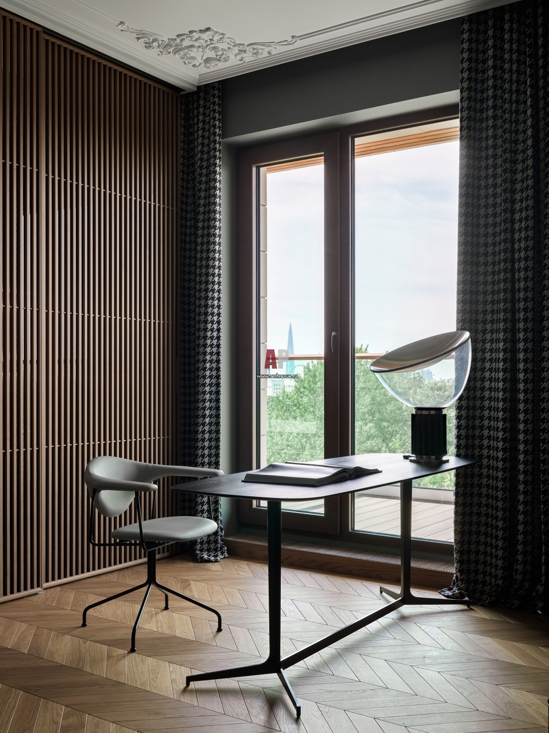 Хозяйский кабинет в мастер-блоке. Рабочий стол, Minotti. Кресло, Gubi. Лампа на столе, Flos.
