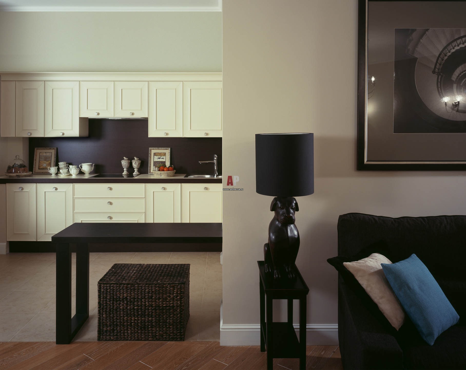 Кухня объединена с гостиной. Фасады кухонного гарнитура Cesar выполнены из дерева, выкрашенного в бежевый оттенок.