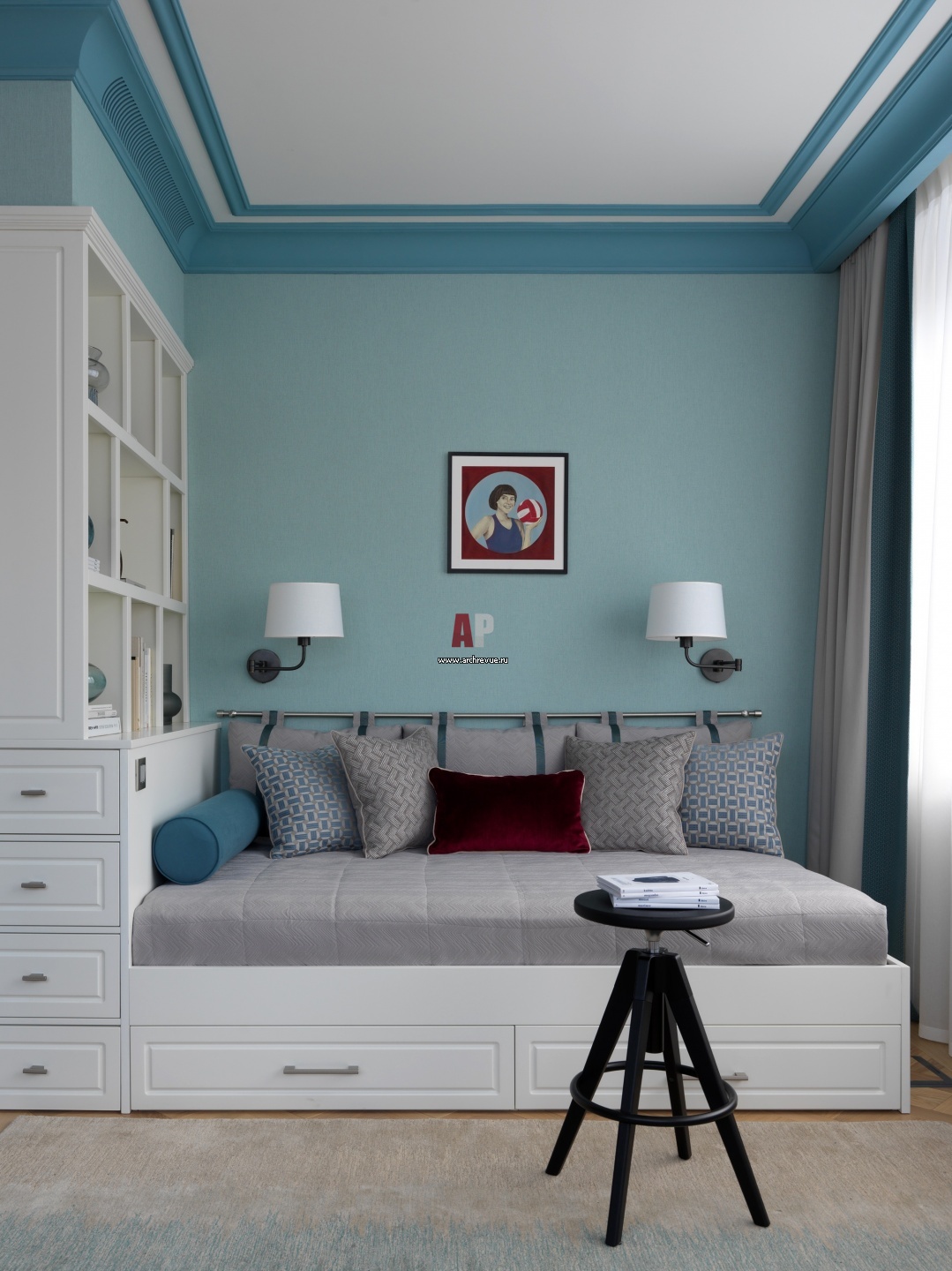 Спальня старшего сына-подростка оформлена в спокойной цветовой гамме. Кровать со встроенными ящиками сделана на заказ.