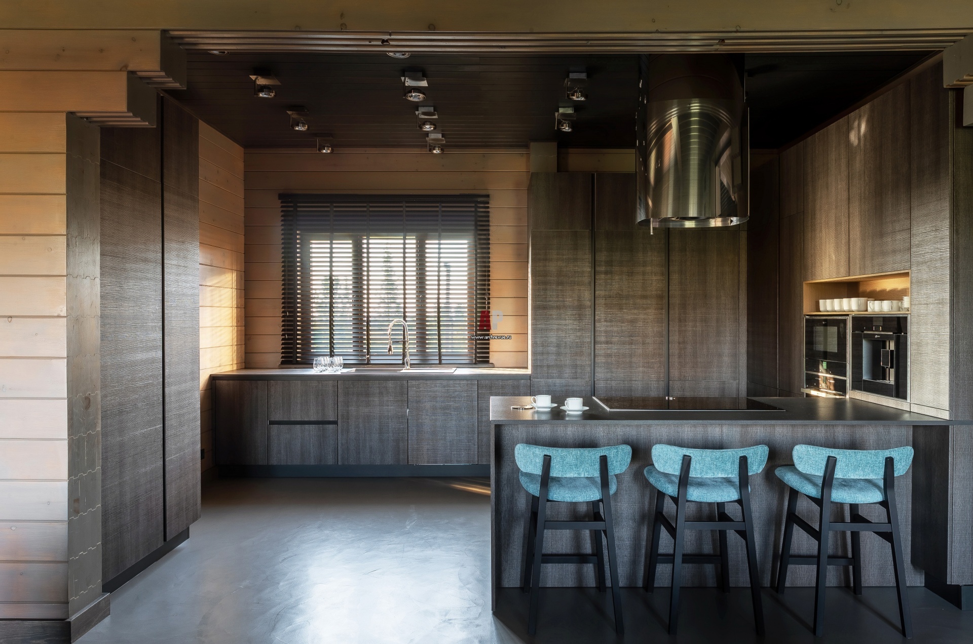 Зона кухни. Кухонный гарнитур, Treo Cucine. Фасады кухни выполнены из брашированного и оттонированного в серый цвет дерева. Барные стулья, Gervasoni.