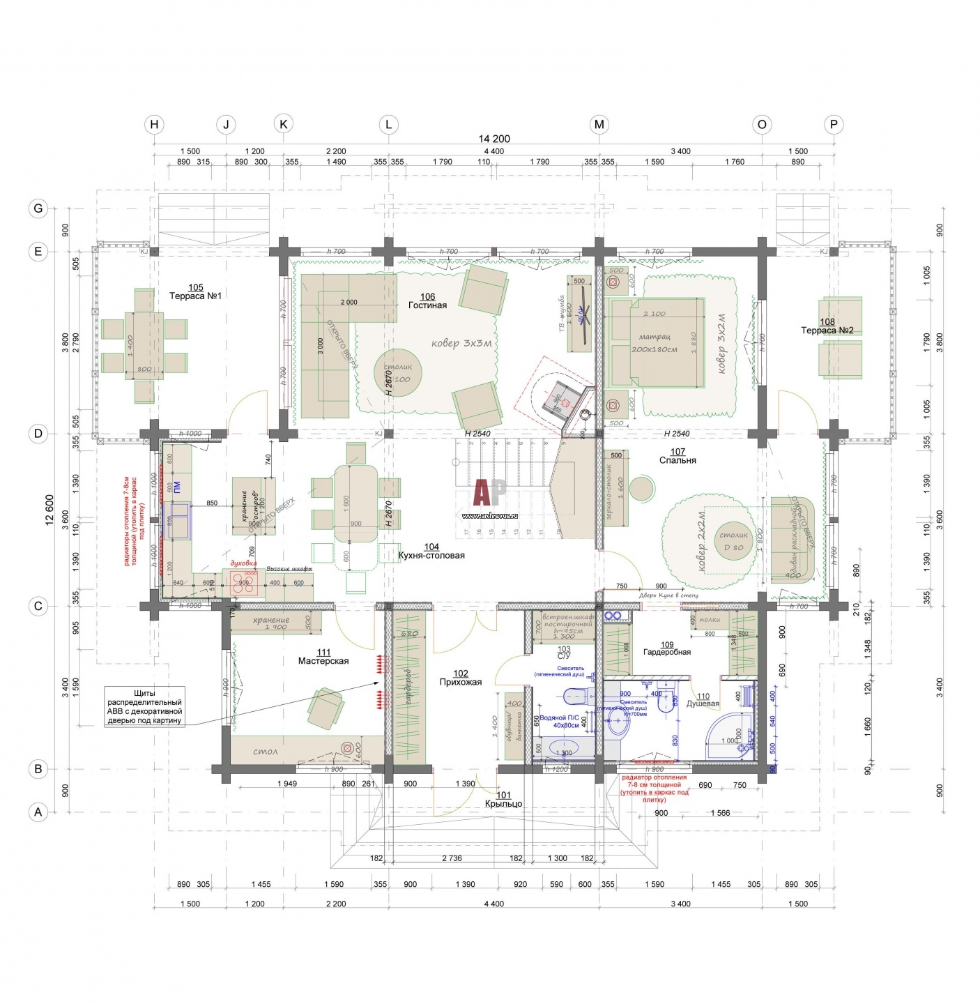 План первого этажа двухэтажного деревянного дома для постоянного проживания. Общая площадь - 234 кв. м.