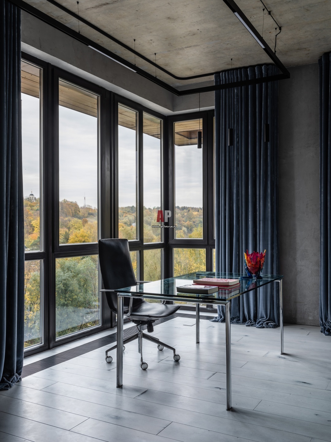 Рабочая зона расположена в угловой части квартиры с окнами в пол.