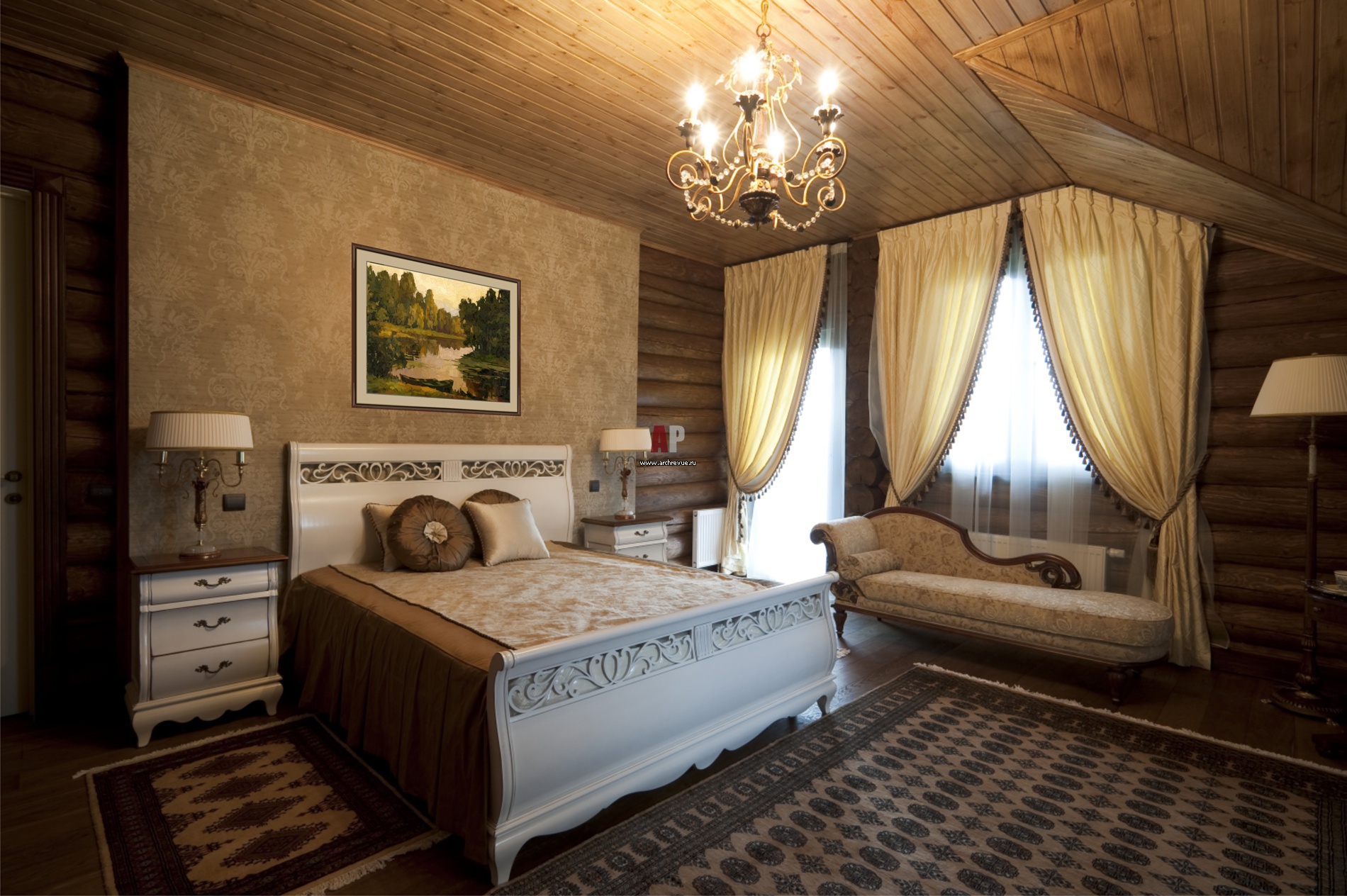 Фото интерьера спальни гостевого деревянного дома в неоклассическом стиле