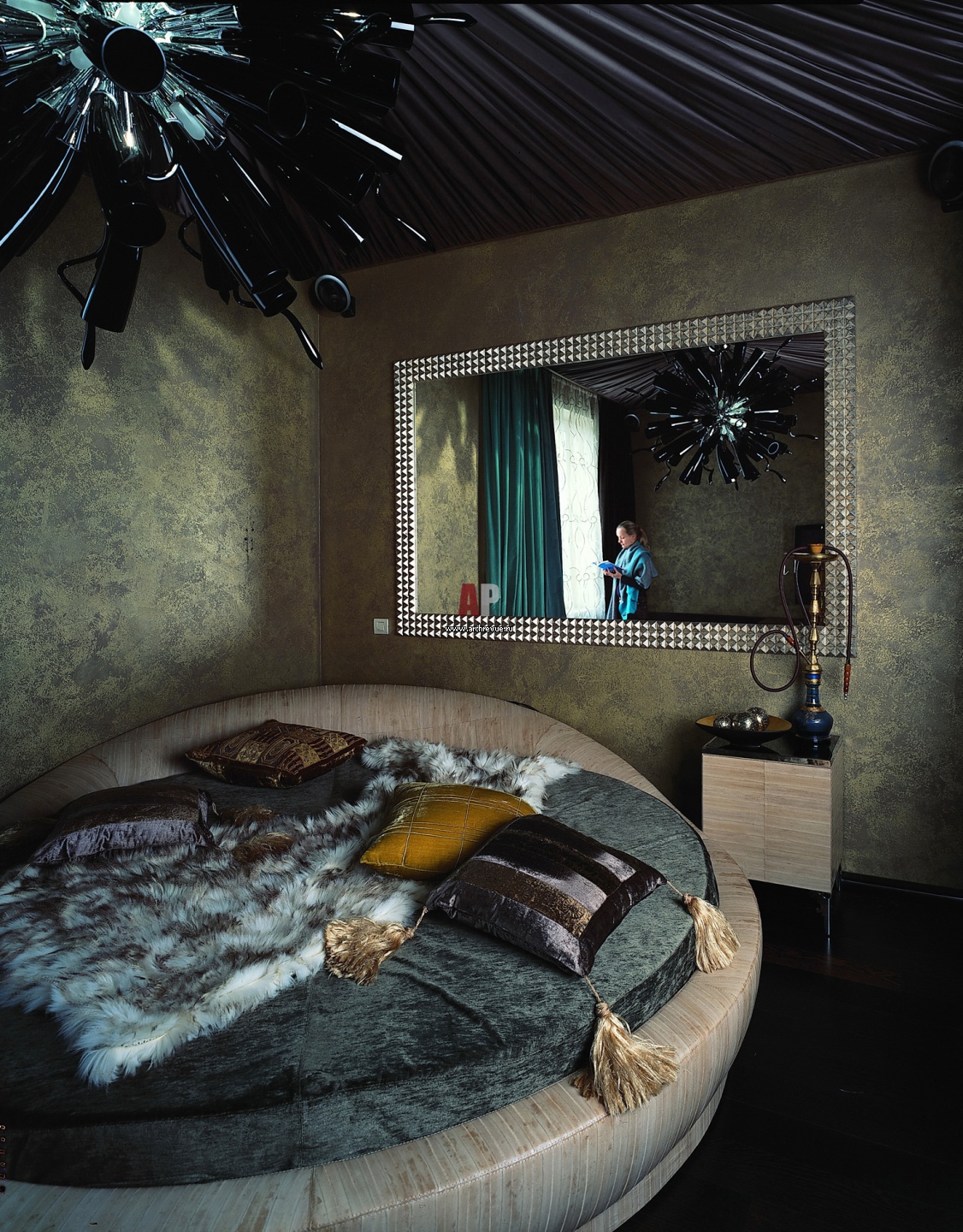 Спальня решена в клубном стиле с легким восточным акцентом с кальянной зоной, авангардной люстрой из черного стекла Artemide и с круглой кроватью Ipe Cavalli. На стенах – декоративная штукатурка с эффектом состаренной бронзы.