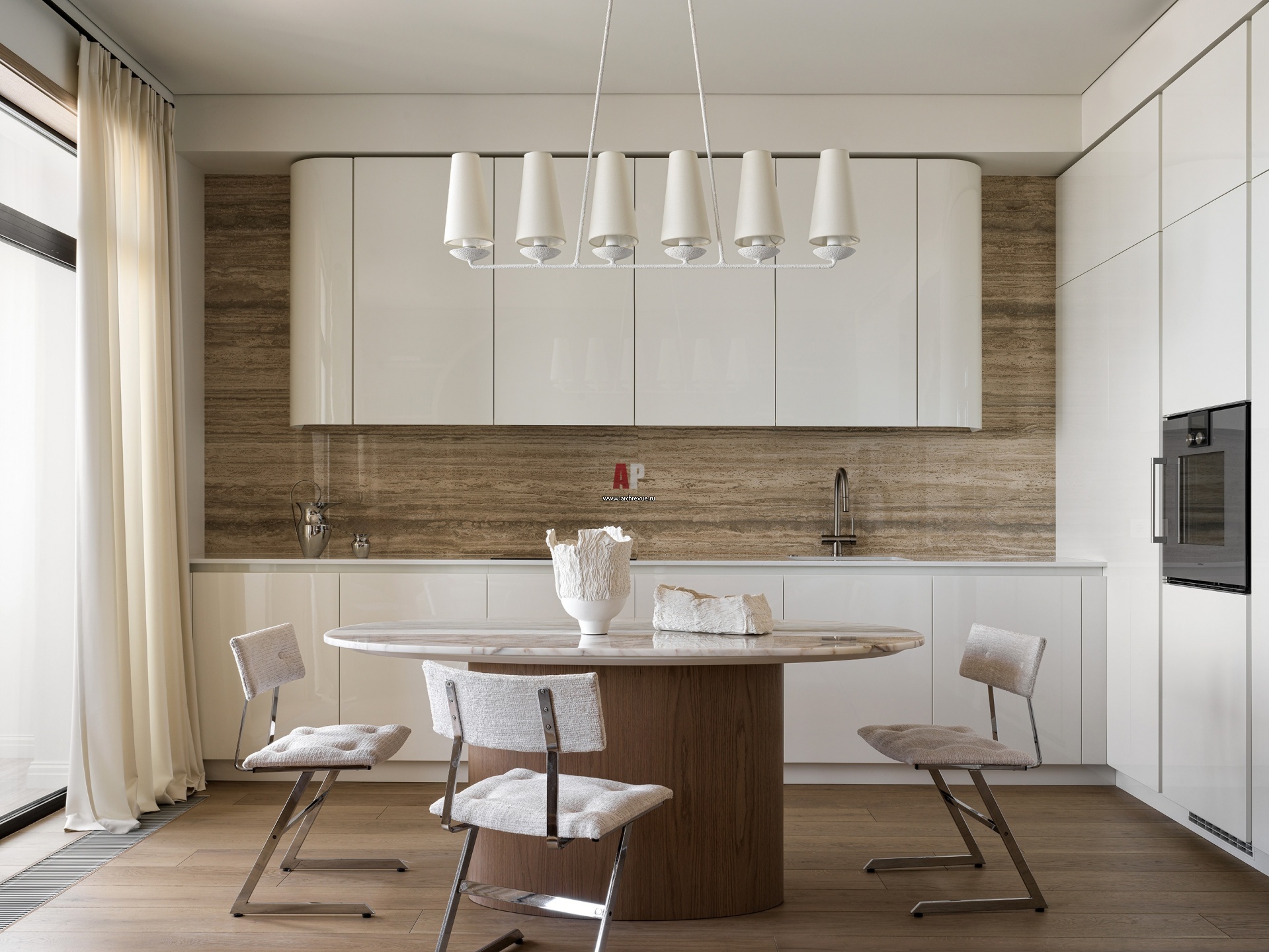 Легкое настроение в гостиной создает оригинальный кухонный гарнитур с молочно-белыми фасадами под глянцевым лаком и высоким травертиновым фартуком. Кухонная мебель, Virs. Обеденные стулья, винтаж.