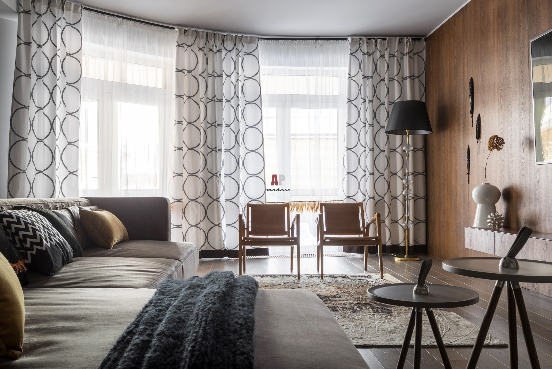 Интерьер гостиной с элементами ретро. Окна оформлены текстилем с большими кругами и настоящими перьями. Основание торшера – винтаж 1950-х годов, изделие привезено из Италии.