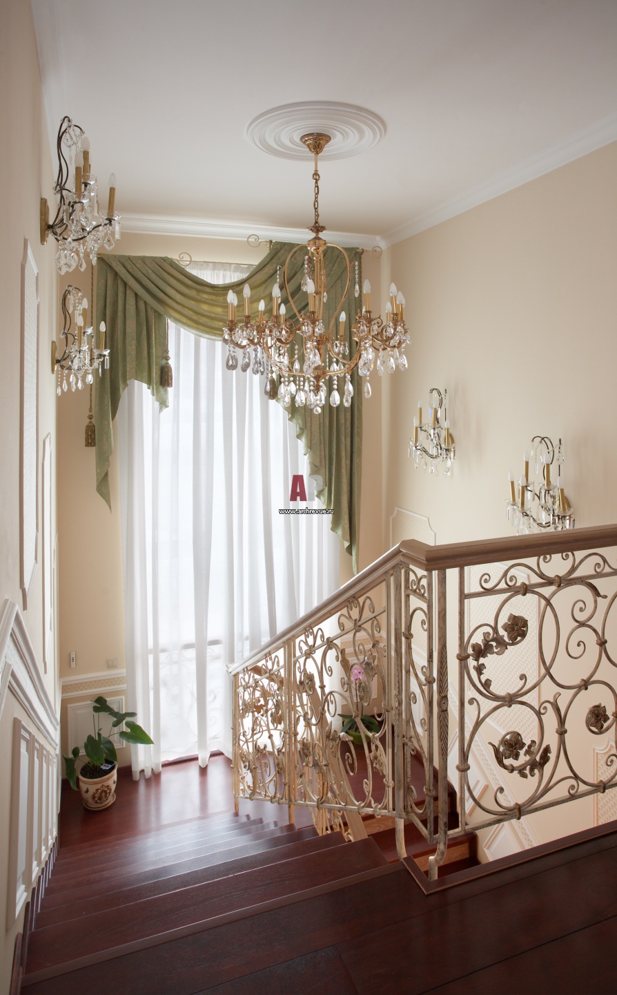 Парадный лестничный холл в классическом духе. Кованое ограждение лестницы с белой патиной и золочением. Хрустальные золоченые люстры, Beby Group.