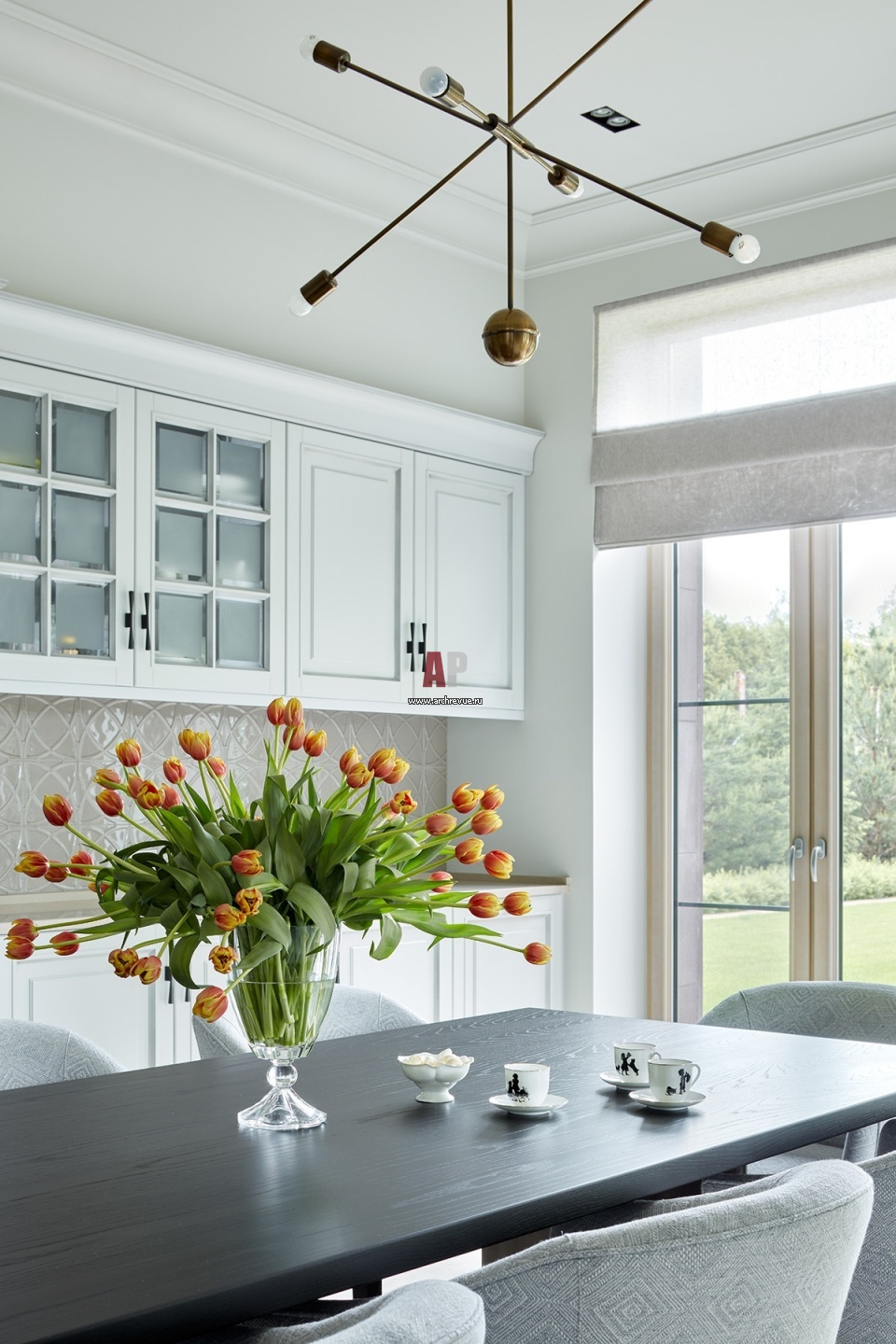Кухня-столовая. Обеденный стол, Minotti. Стулья, Marie's Corner. Кухня и светильники сделаны на заказ.
