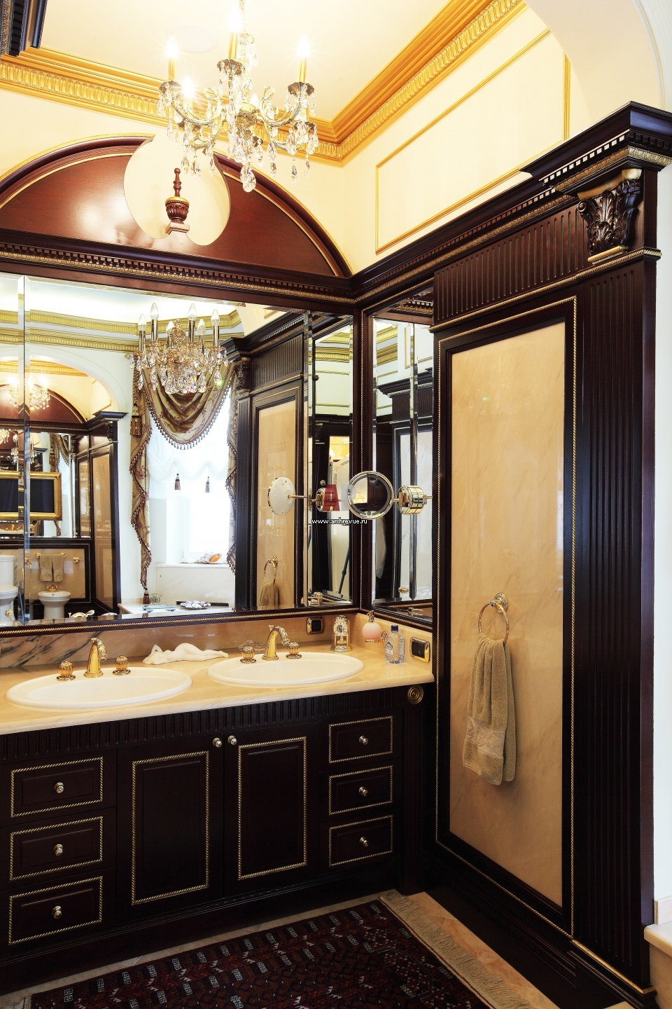 Ванная комната в классическом стиле. Умывальник обрамлен деревянным порталом с мраморными вставками. Сантехника, Villeroy & Boch.