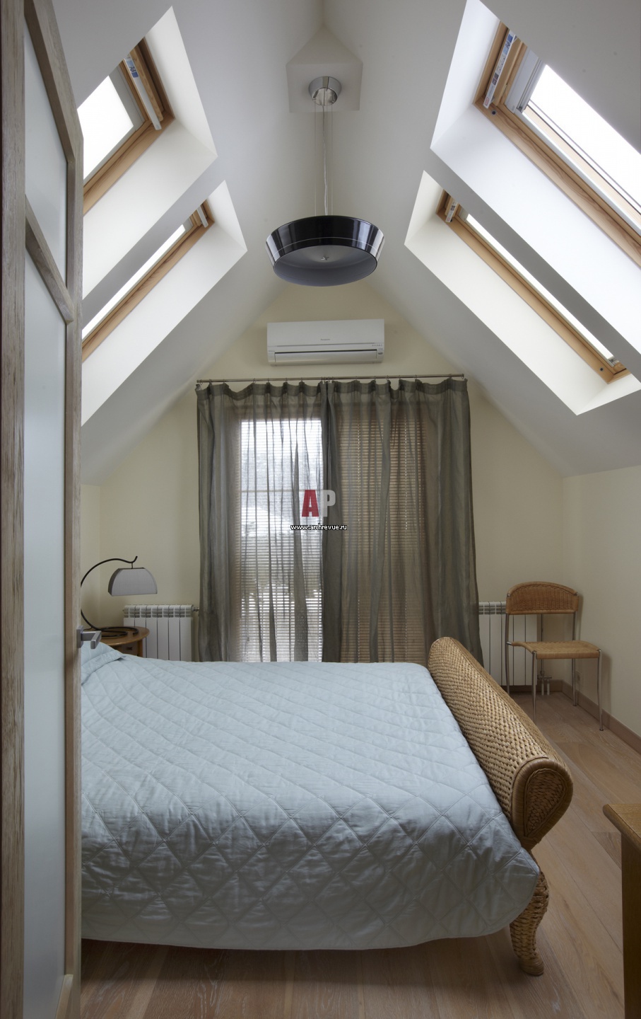 Спальня со скатной кровлей. Мансардные окна VELUX дают много света.