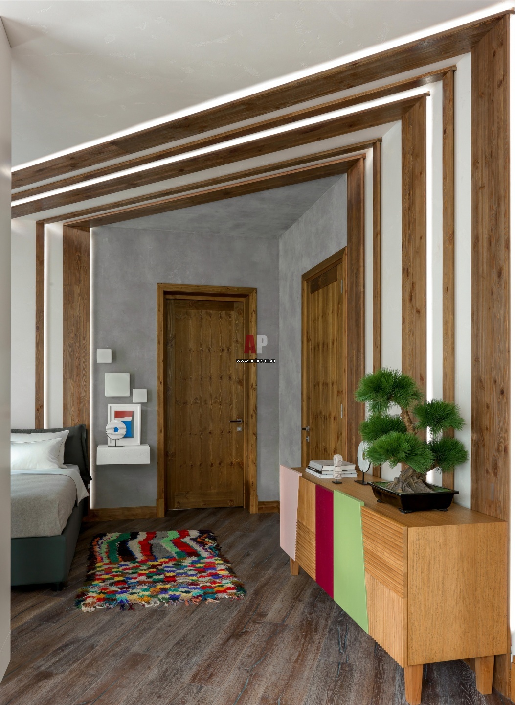 Оформление потолка и стен в гостевой спальне имитирует традиционную для шале балочную систему. Деревянные рейки с подсветкой подчеркивают сложную геометрию комнаты с большим количеством граней. Комод, Devina Nais.