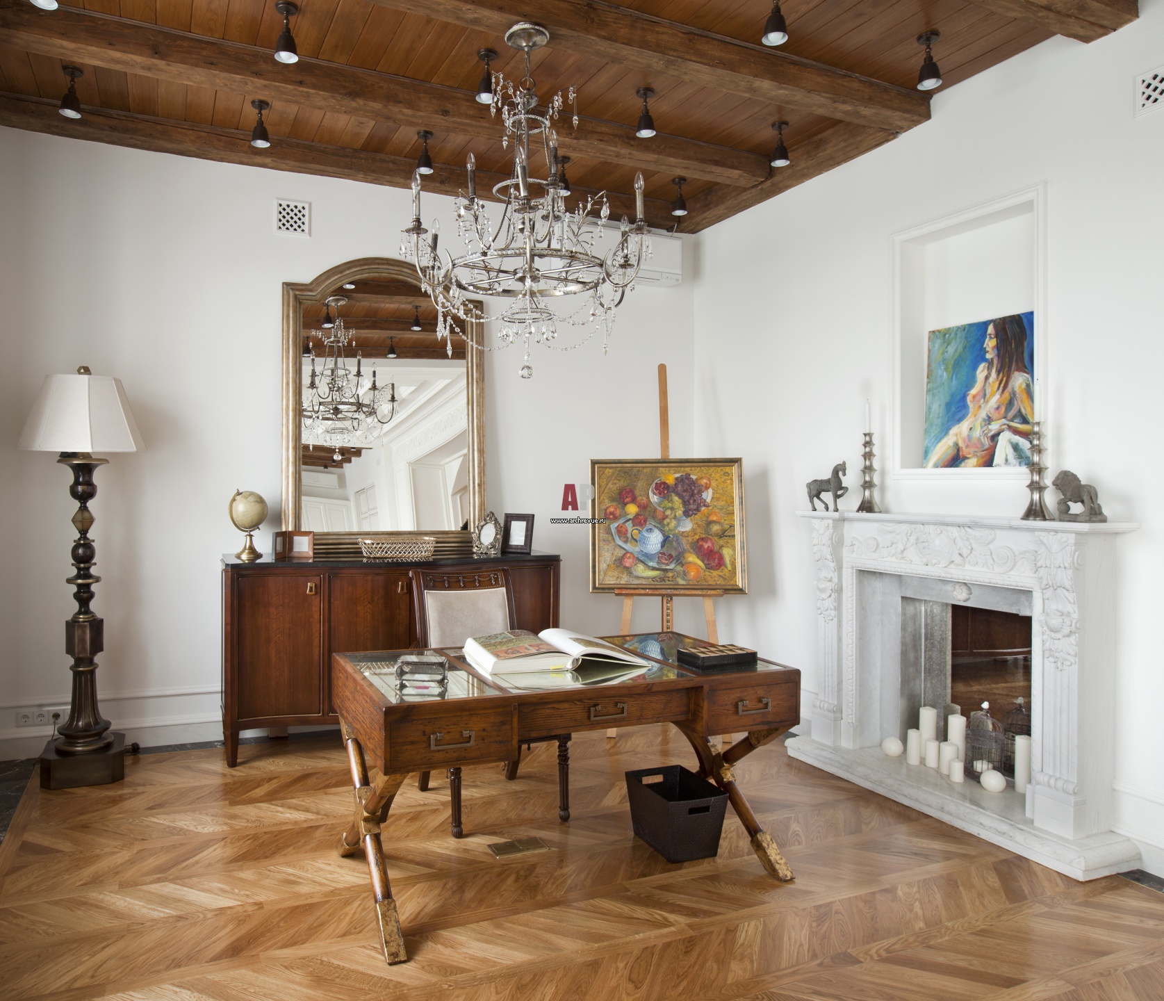 Интерьер зоны кабинета в общей гостиной. Портал камина выполнен из белого камня. Над каминной полкой лепным молдингом выделено место для экспрессивной картины художницы Гульнары Чокубаевой.