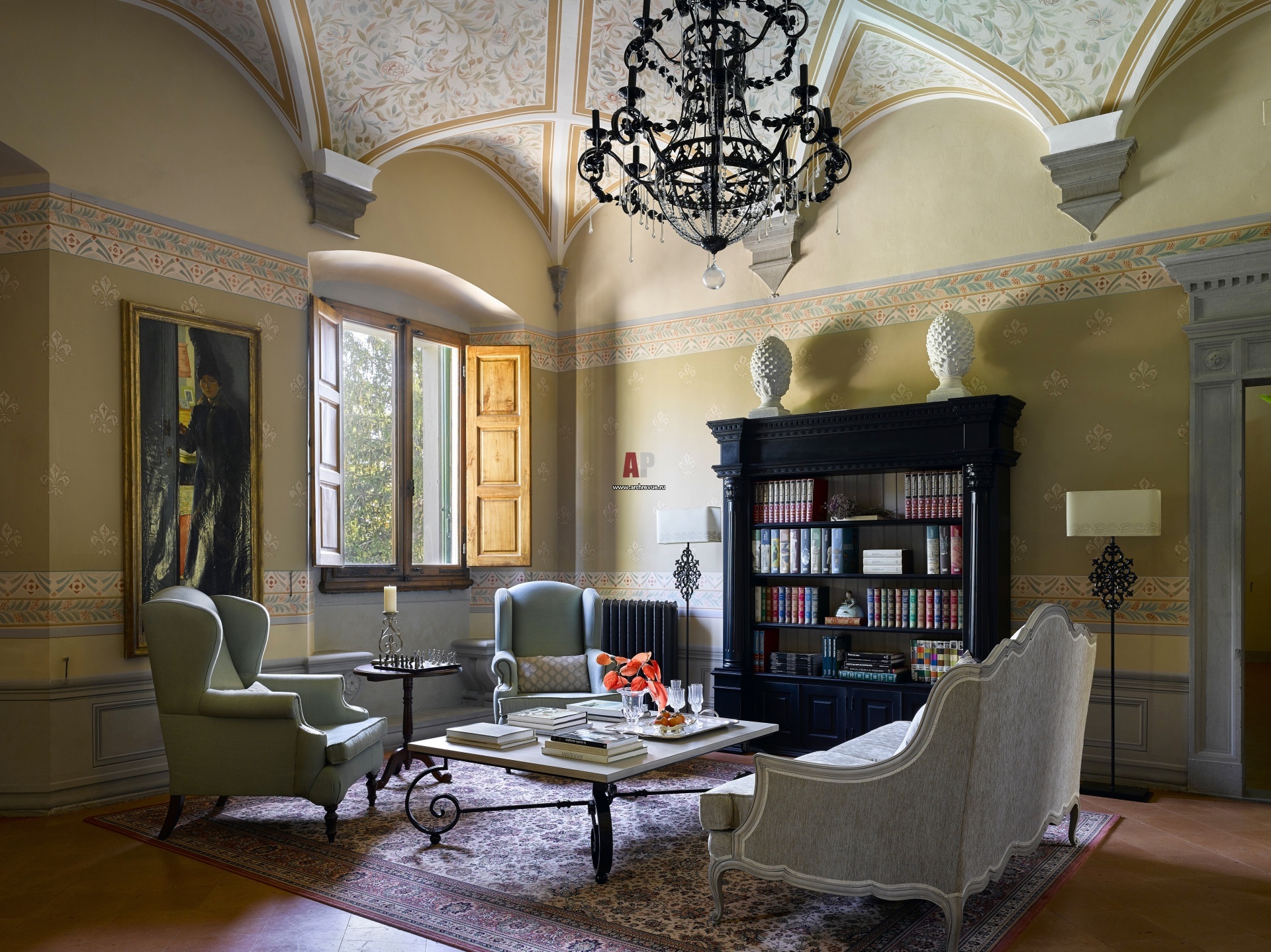 Традиционная вилла в Италии. Главная гостиная. Деревянные ставни на окнах, дверные порталы, стеновые панели – исторические.