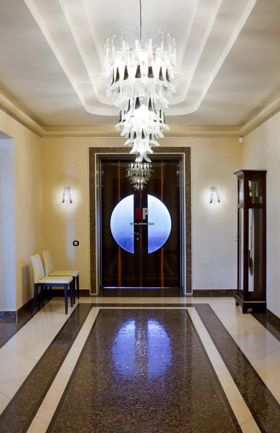 Холл в стиле ар-деко. Дверь из макасара под глянцевым лаком и полукруглыми витражами из прозрачного стекла изготовлена по эскизам архитектора. Она обрамлена кантом из мозаики. Тема мозаики продолжена на полу. Поставщик мозаики, BARS RED.