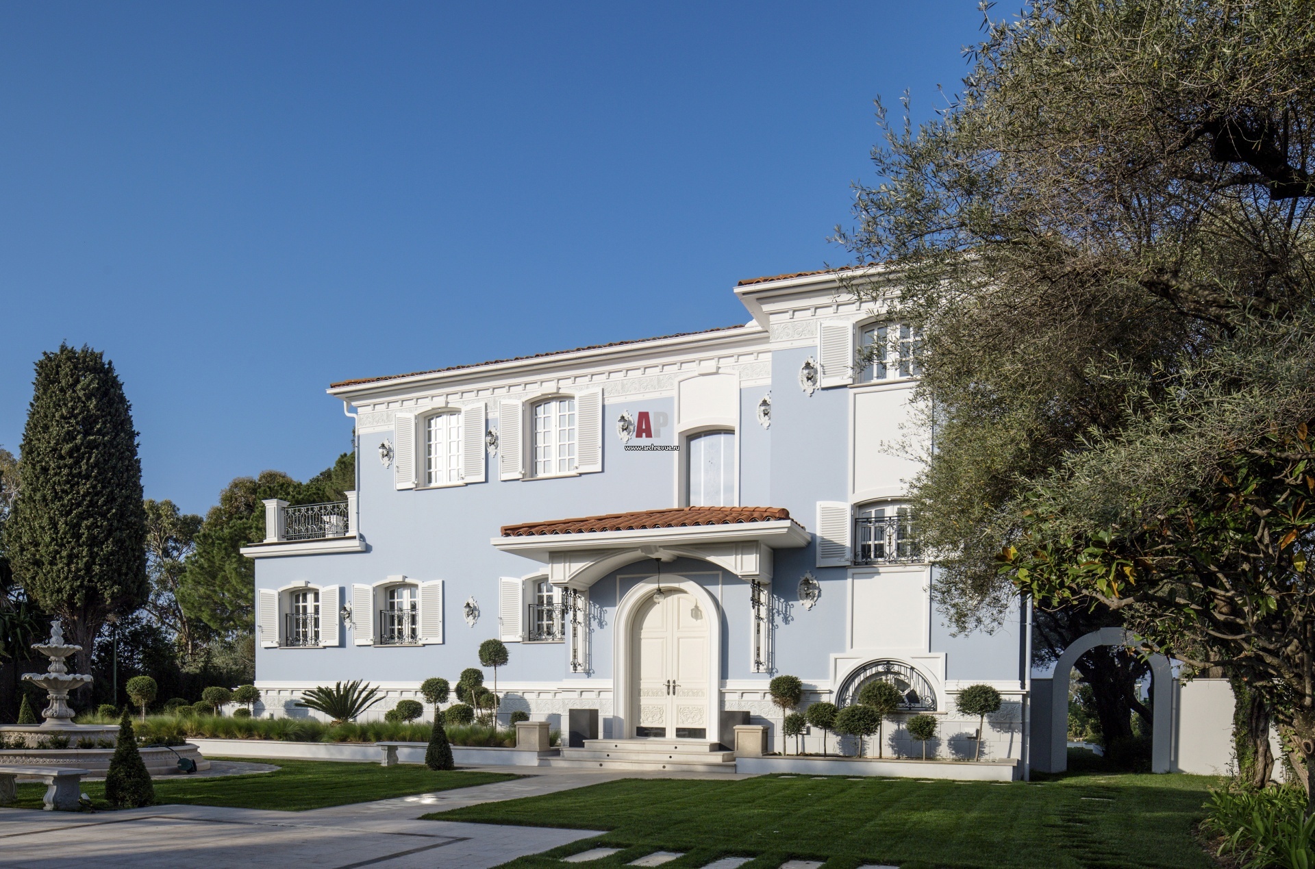 Средиземноморская вилла с бассейном в стиле бель-эпок. Ставни на окнах, рустовка цокольного этажа и черепичная кровля – реверанс в сторону истории и культуры региона, где расположен дом.