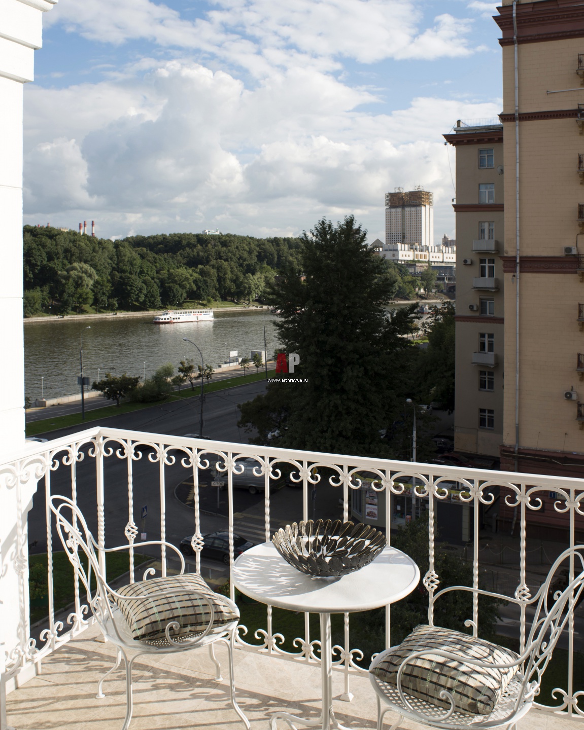 Балкон с видом на высотку Российской академии наук. Кованая уличная мебель перекликается с дизайном ограждения балкона.