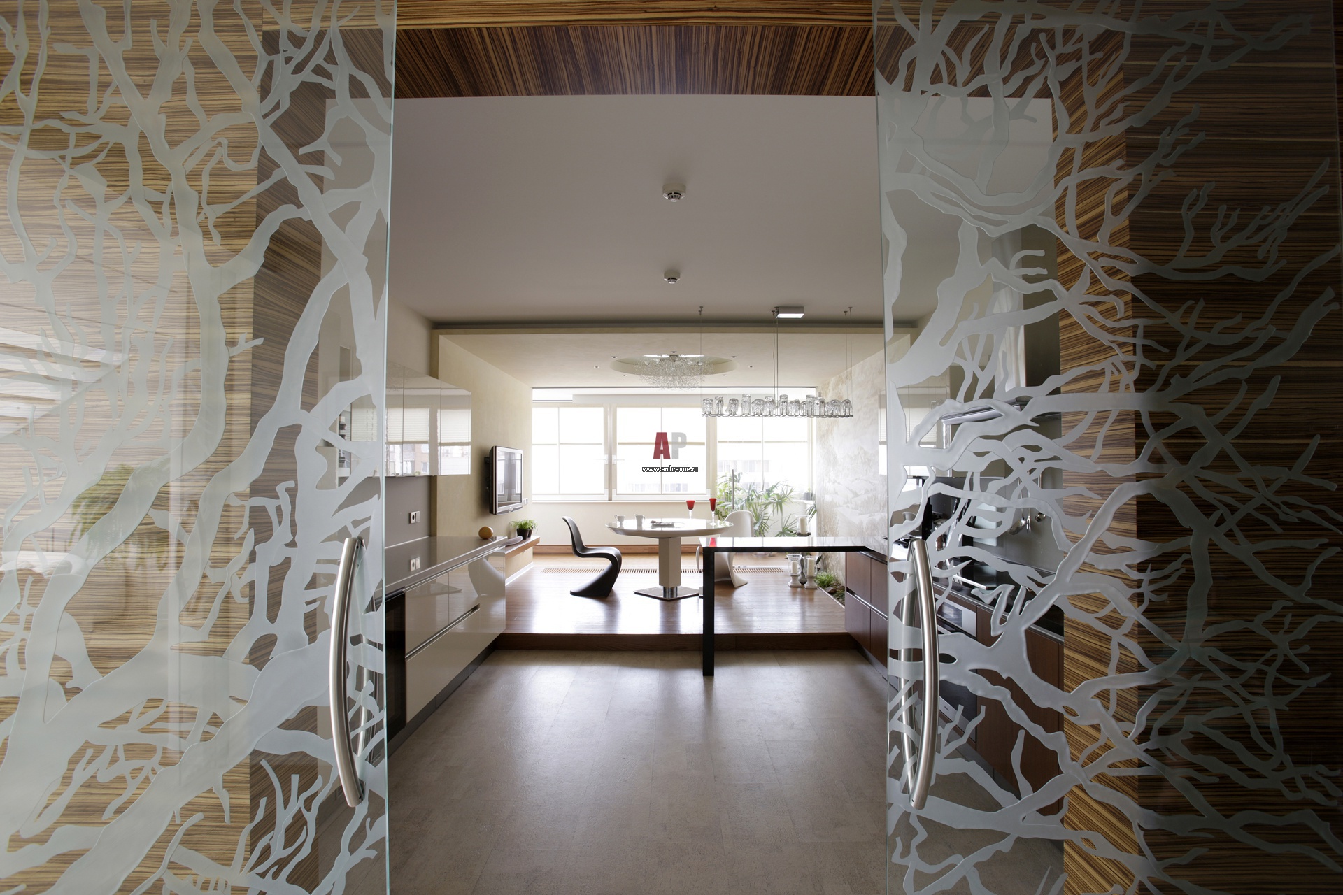 Изолированная кухня выглядит современно и лаконично. От гостиной ее отделяют раздвижные стеклянные перегородки, на них пескоструйным методом нанесен орнамент в виде силуэтов деревьев.