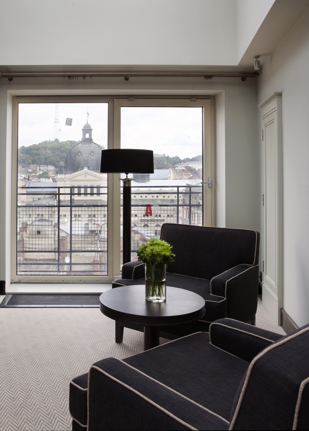 Номер-«люкс» на последнем этаже. Но полу – серый ковролин, стены выкрашены однотонной краской. Мебель в черной обивке, Marie's Corner.