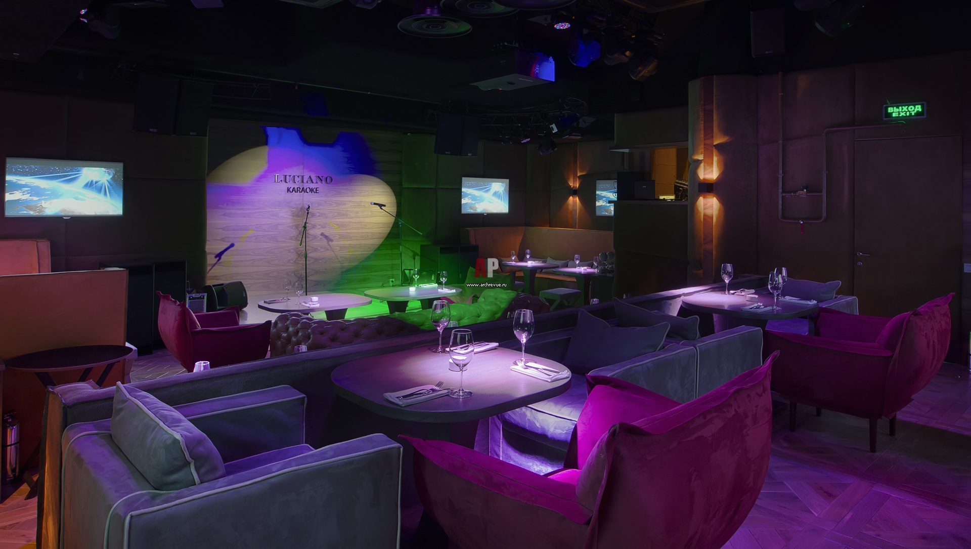 Интерьер караоке организован на двух уровнях. На нижнем уровне находится сцена с большим экраном.Деревянная мебель, изготовление Beni.