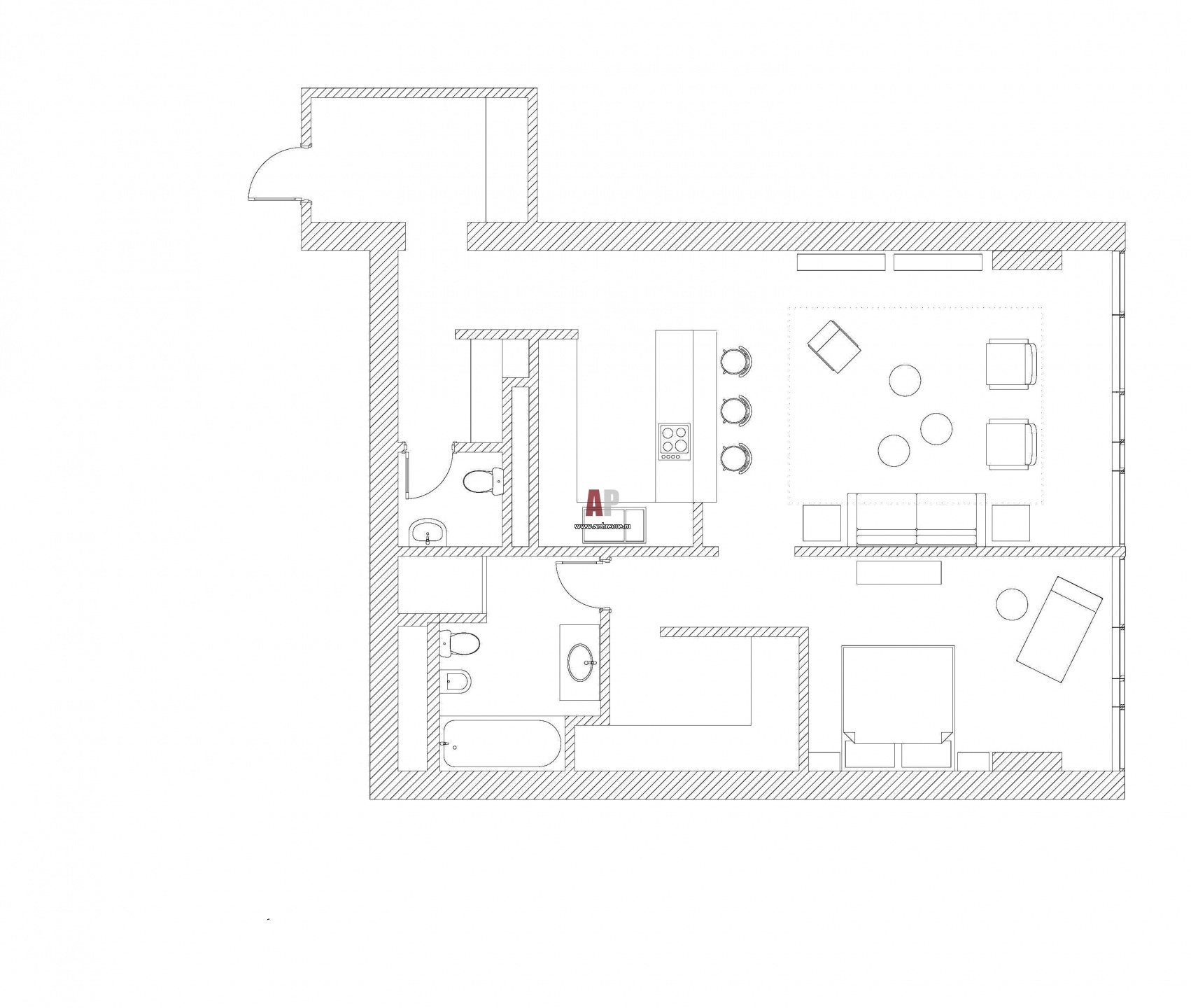 Планировка видовой квартиры для временного проживания с одной спальней и двумя санузлами.