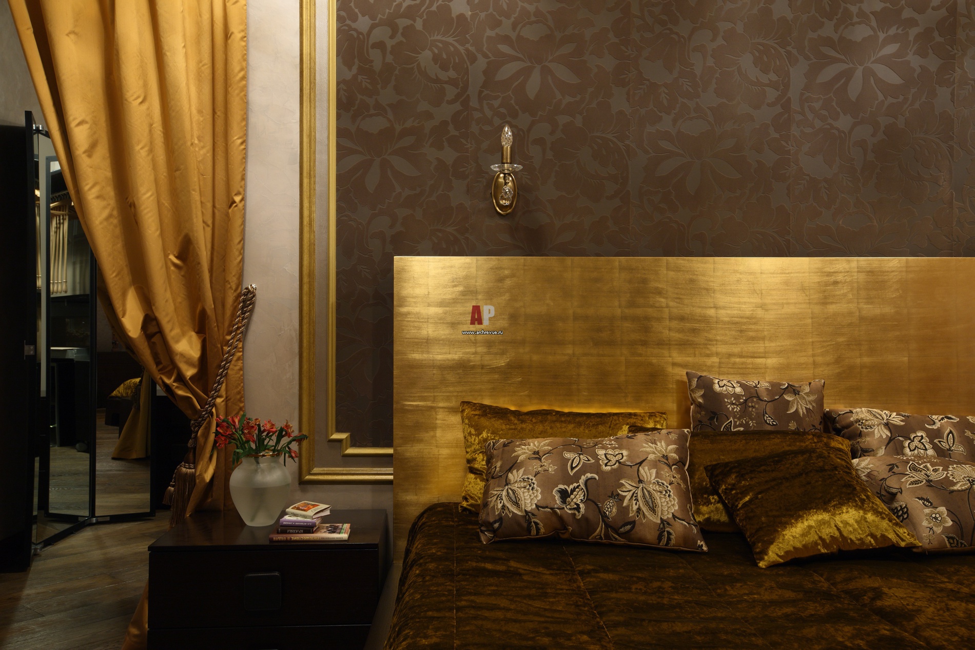За золотым изголовьем кровати Besana – обои с бархатным объемным рисунком.