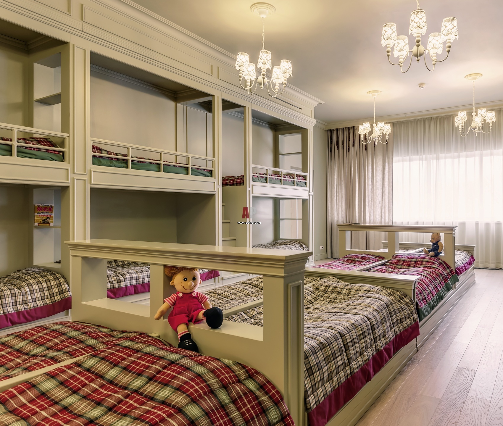Спальные места в старшей группе объединены в общие композиции. Вдоль стен расположены двухъярусные кровати, в их композицию включены лестницы, переходы, колонны. Вся мебель сделана на заказ по чертежам архитекторов.